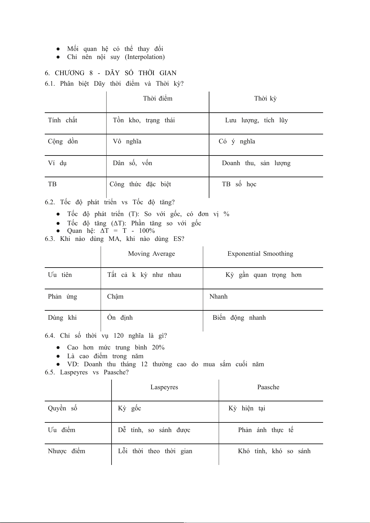 6.1. Phân biệt Dãy thời điểm và Thời kỳ? Thời điểm Thời kỳ Tính chất Tồn kho, trạng thái Lưu lượng, tích lũy Cộng dồn Vô nghĩa Có ý nghĩa Ví dụ Dân số, vốn Doanh thu, sản lượng TB Công thức đặc biệt TB số học
