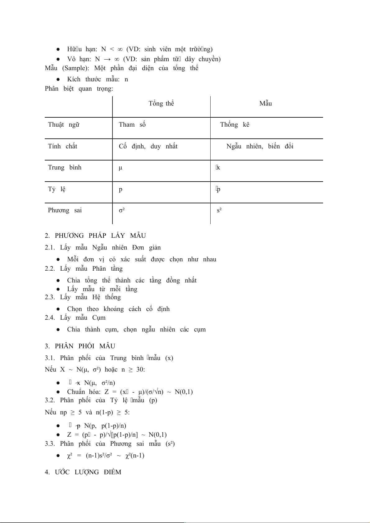 Mẫu (Sample): Một phần đại diện của tổng thể ● Kích thước mẫu: n Phân biệt quan trọng: Tổng thể Mẫu Thuật ngữ Tham số Thống kê Tính chất Cố định, duy nhất Ngẫu nhiên, biến đổi Trung bình μ x Tỷ lệ p p Phương sai σ² s² 2. PHƯƠNG PHÁP LẤY MẪU