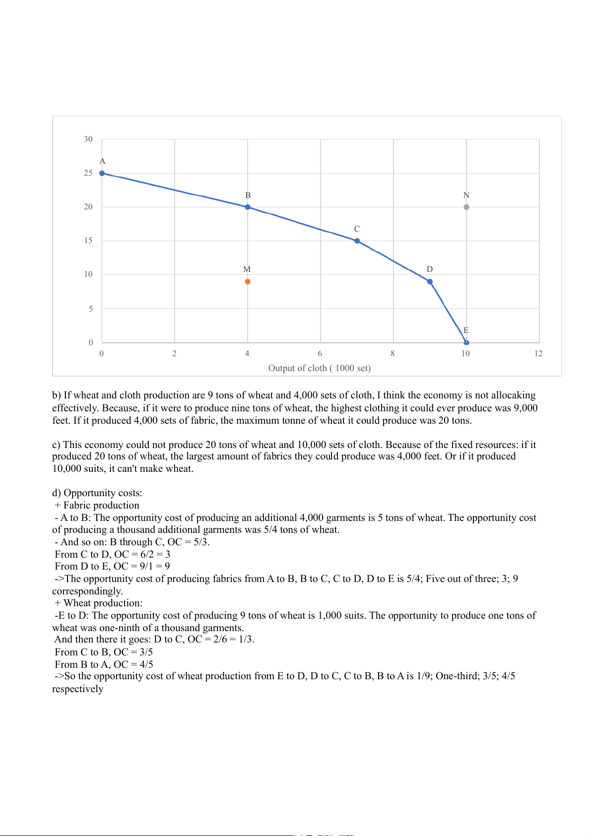 a) Here is PPF for this economy : 30 A 25 B N 20 C heat (tons) 15 M D utput of w 10 O 5 E 0 0 2 4 6 8 10 12 Output of cloth ( 1000 set)