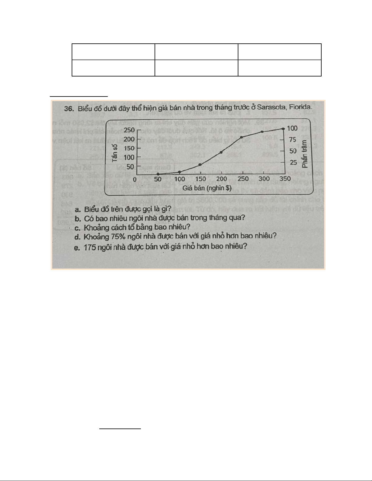 tính: Giá trị này nằm trong khoảng tổ [200;250] nghìn $, với tần số tích lũy từ 125 đến 212,5 Giá = 200 + (187,5 − 125) (212,5 − 125) × 50 ≈ 235, 7