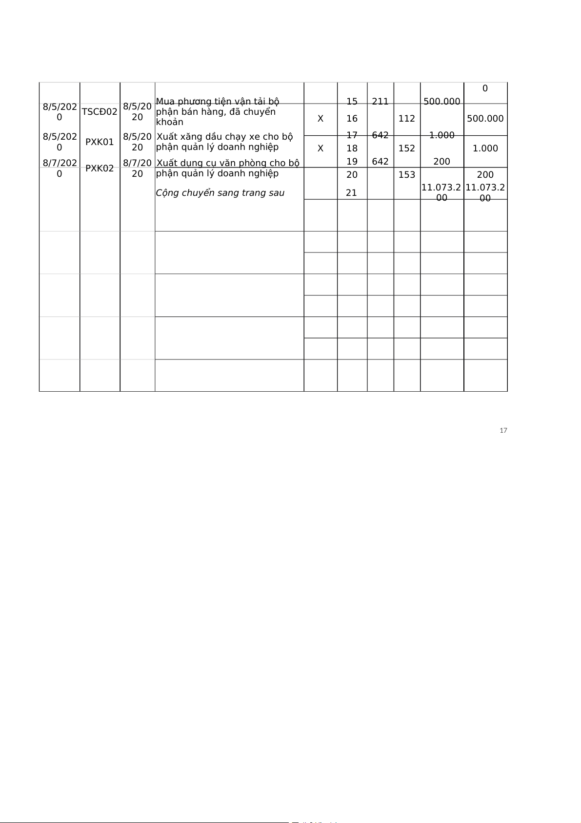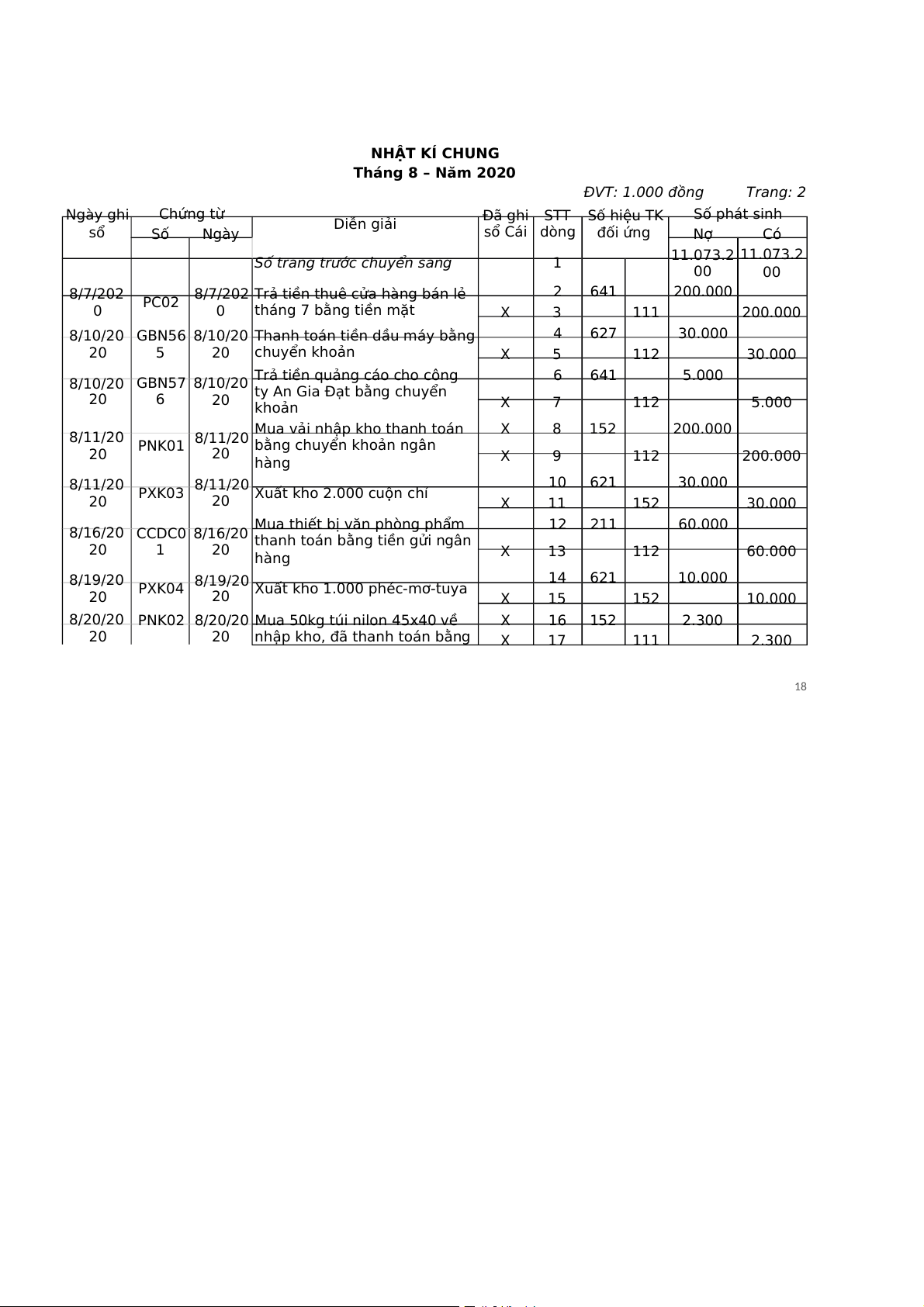 Cộng chuyển sang trang sau 21 11.073.2 11.073.2 00 00 17 NHẬT KÍ CHUNG Tháng 8 – Năm 2020 ĐVT: 1.000 đồng Trang: 2 Ngày ghi Chứng từ STT Số hiệu TK Số phát sinh sổ Diễn giải Đã ghi Số Ngày sổ Cái dòng đối ứng Nợ Có