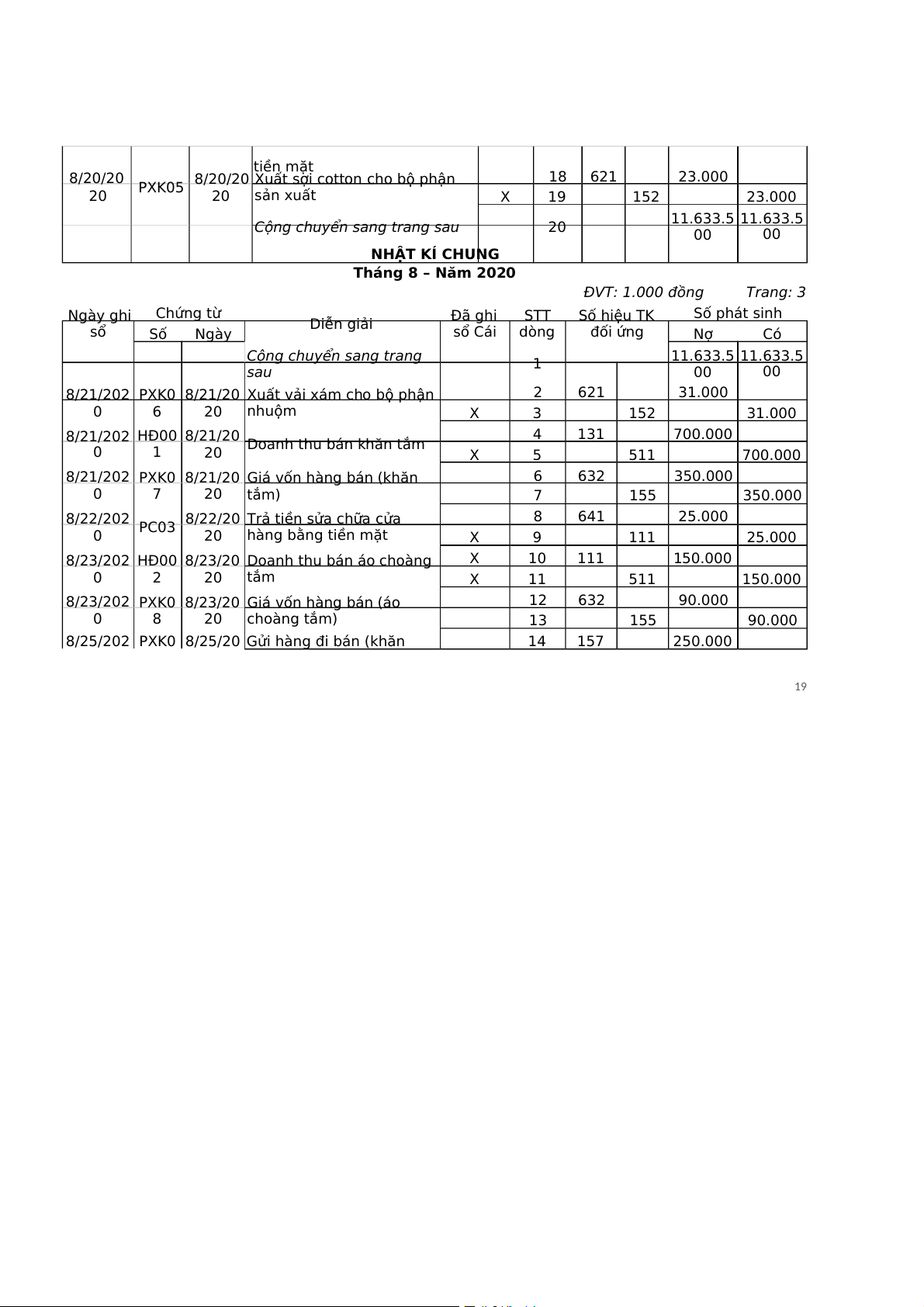 Cộng chuyển sang trang sau 20 11.633.5 11.633.5 00 00 NHẬT KÍ CHUNG Tháng 8 – Năm 2020 ĐVT: 1.000 đồng Trang: 3 Ngày ghi Chứng từ STT Số hiệu TK Số phát sinh sổ Diễn giải Đã ghi Số Ngày sổ Cái dòng đối ứng Nợ Có