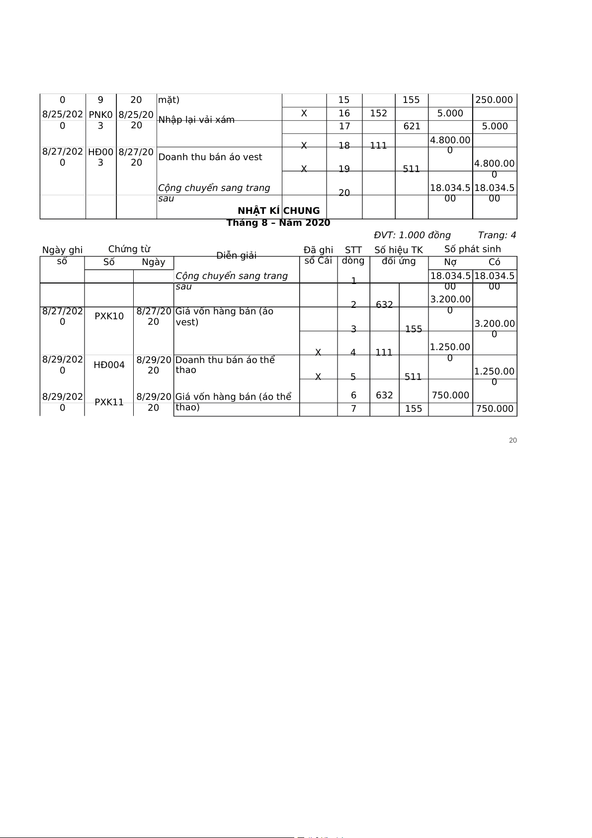 Cộng chuyển sang trang 18.034.5 sau 1 18.034.5 00 00 2 632 3.200.00 8/27/202 Giá vốn hàng bán (áo 0 0 PXK10 8/27/20 20 vest) 3 155 3.200.00 0 X 4 111 1.250.00 8/29/202 Doanh thu bán áo thể 0 0 HĐ004 8/29/20 20 thao X 5 511 1.250.00 0 8/29/202