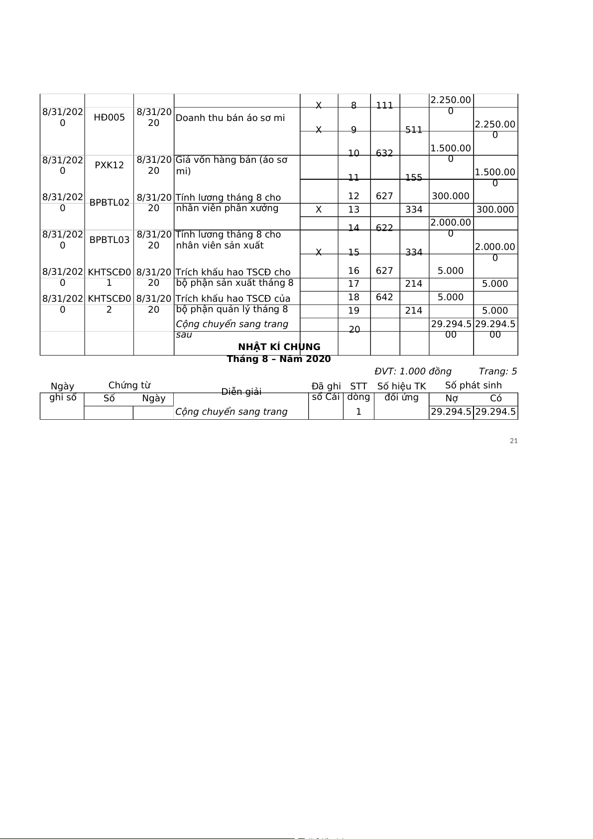 Cộng chuyển sang trang 29.294.5 sau 20 29.294.5 00 00 NHẬT KÍ CHUNG Tháng 8 – Năm 2020 ĐVT: 1.000 đồng Trang: 5 Ngày Chứng từ STT Số hiệu TK Số phát sinh ghi sổ Diễn giải Đã ghi Số Ngày sổ Cái dòng đối ứng Nợ Có