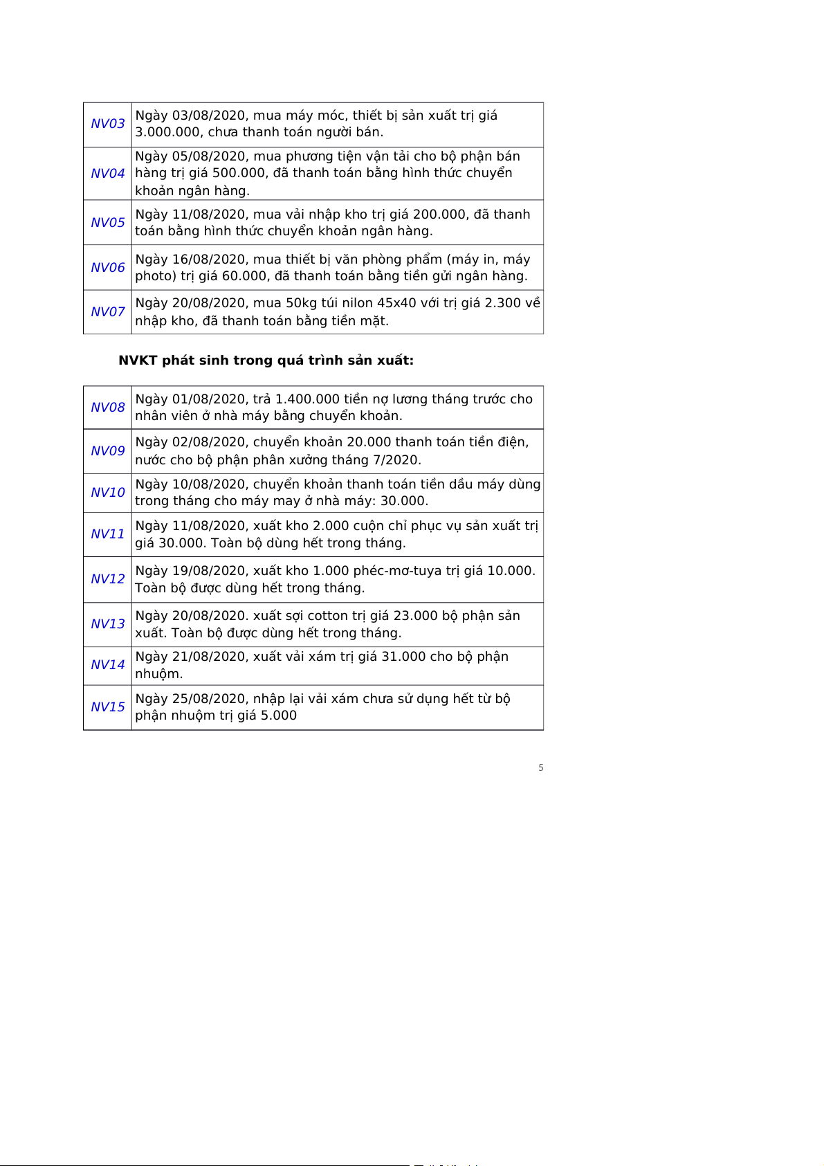 NV05 toán bằng hình thức chuyển khoản ngân hàng.