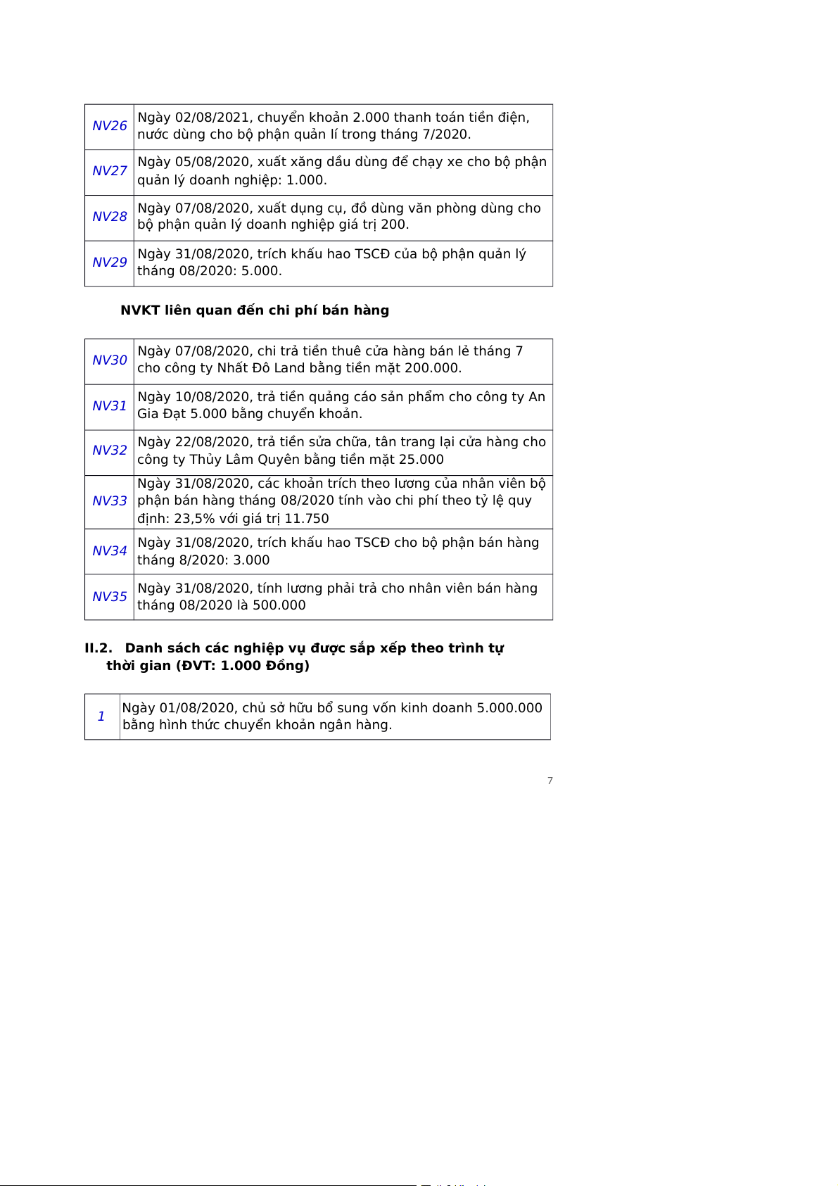II.2. Danh sách các nghiệp vụ được sắp xếp theo trình tự thời gian (ĐVT: