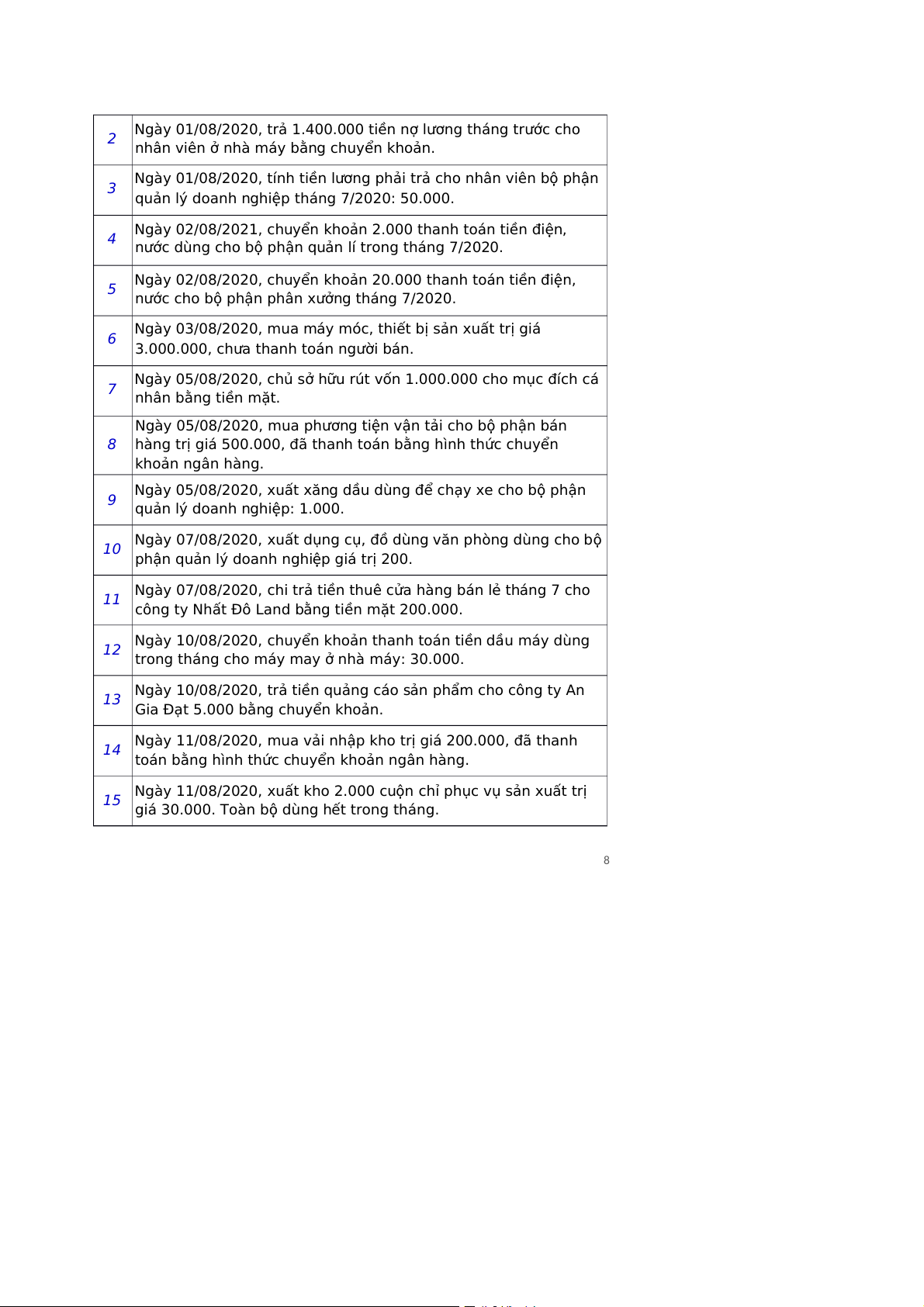 Hóa đơn tiền điện, nước 5 02/08/2020 Giấy báo nợ Ủy nhiệm chi Hóa đơn GTGT Biên bản giao nhận TSCĐ 6 03/08/2020 Đơn đặt hàng Hợp đồng kinh tế Phiếu chi 7