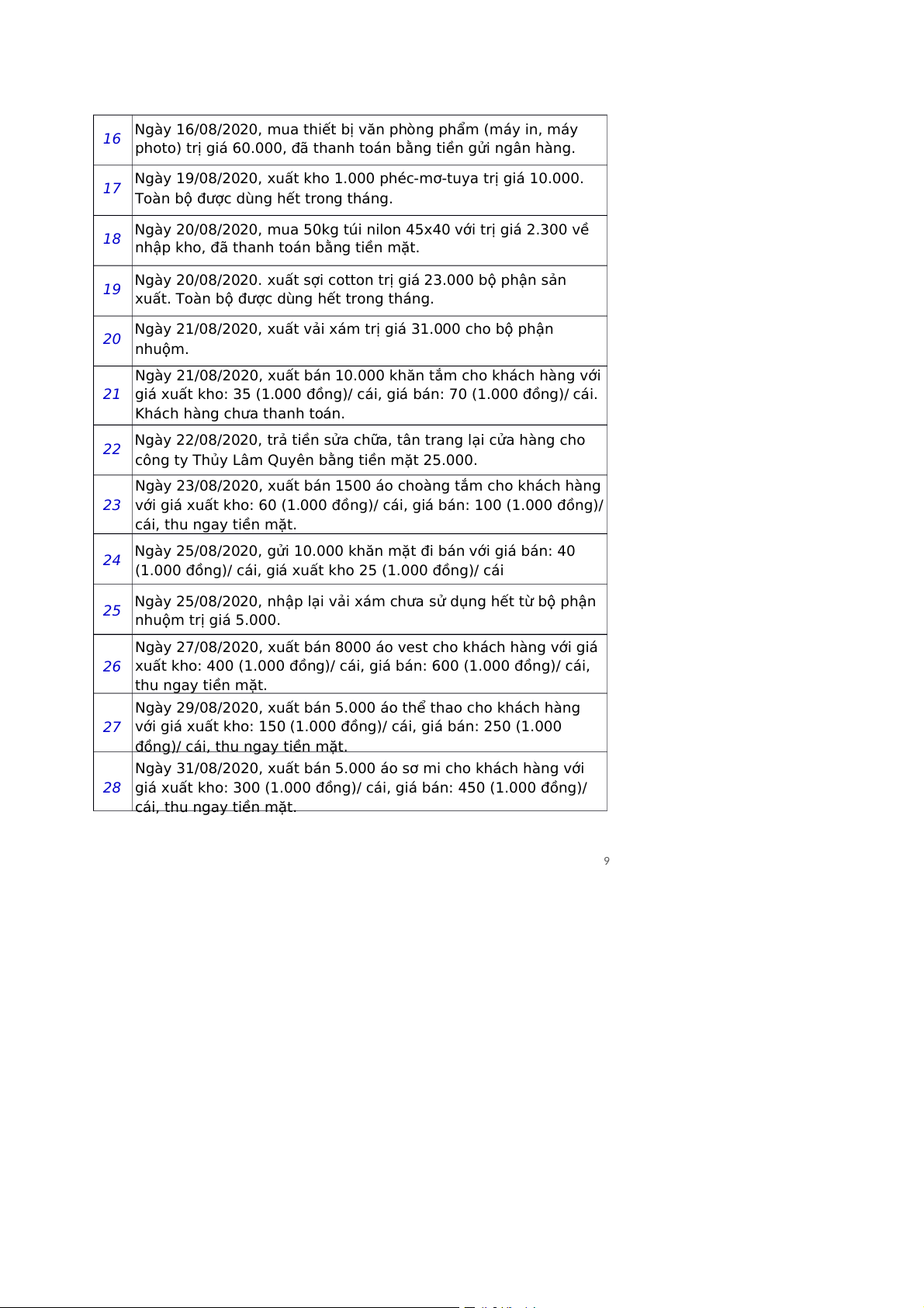16/08/2020 Biên bản giao nhận TSCĐ Đơn đặt hàng Hợp đồng kinh tế 17 19/08/2020 Phiếu xuất kho. Phiếu chi Hóa đơn GTGT 18 20/08/2020 Phiếu nhập kho Hợp đồng kinh tế Đơn đặt hàng Phiếu xuất kho 19
