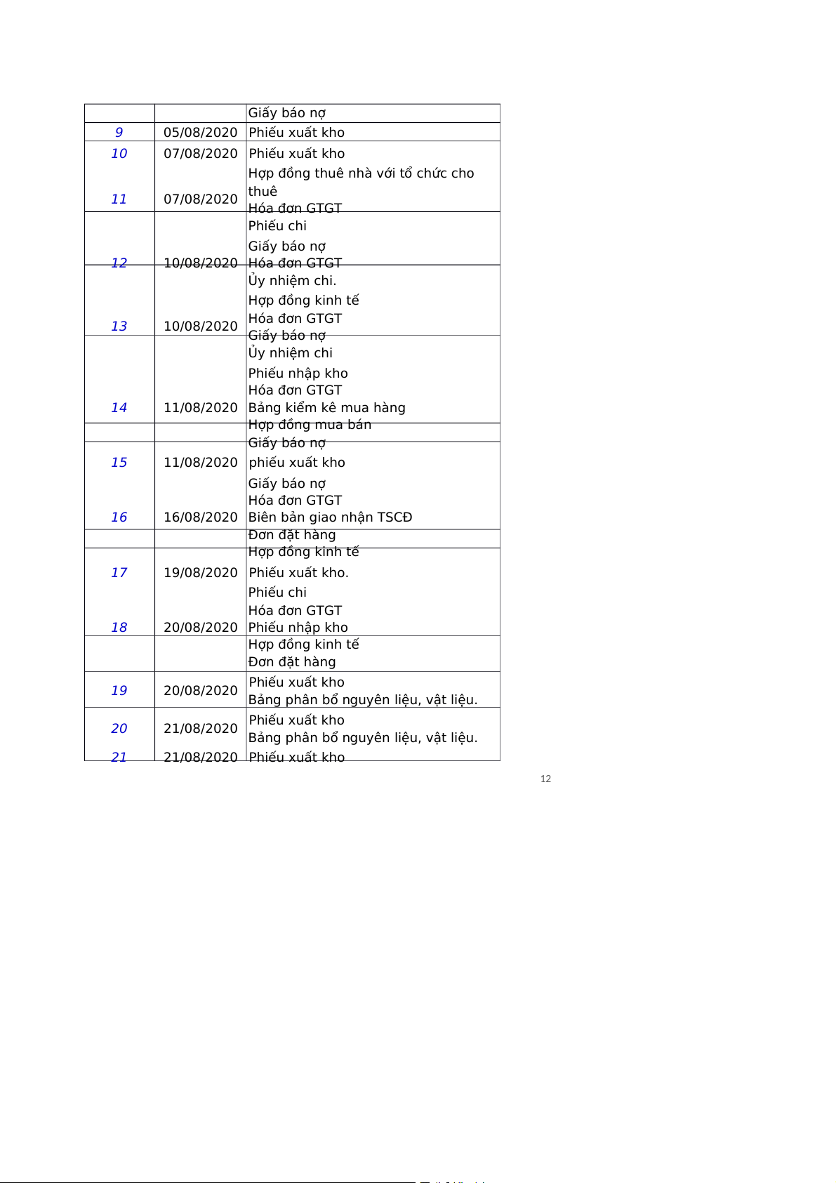 Hợp đồng thuê nhà với tổ chức cho 11 07/08/2020 thuê Hóa đơn GTGT Phiếu chi Giấy báo nợ 12 10/08/2020 Hóa đơn GTGT Ủy nhiệm chi. Hợp đồng kinh tế 13 10/08/2020 Hóa đơn GTGT Giấy báo nợ Ủy nhiệm chi Phiếu nhập kho Hóa đơn GTGT 14