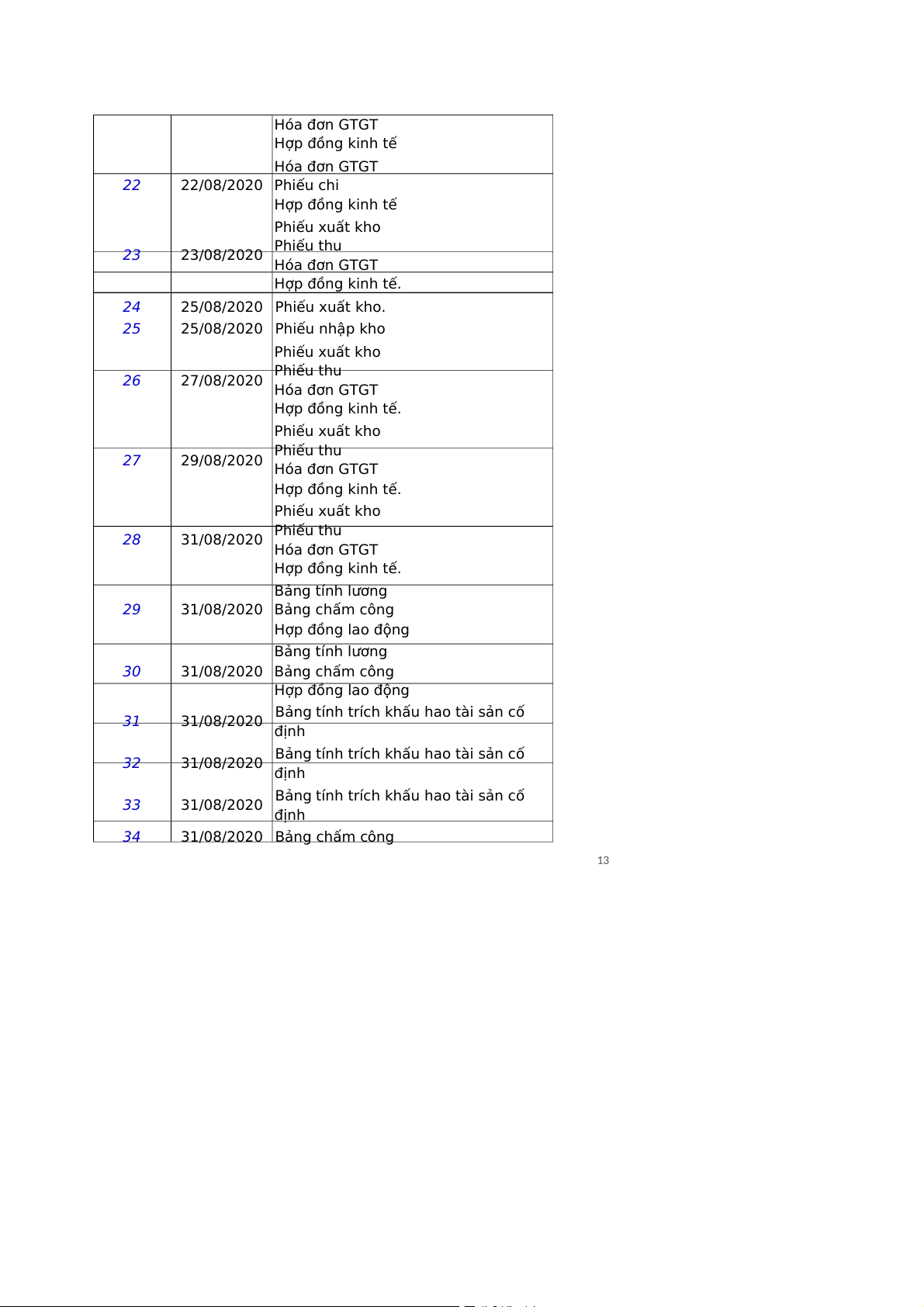 21/08/2020 Bảng phân bổ nguyên liệu, vật liệu. 21 21/08/2020 Phiếu xuất kho 12 Hóa đơn GTGT Hợp đồng kinh tế Hóa đơn GTGT 22 22/08/2020 Phiếu chi Hợp đồng kinh tế Phiếu xuất kho Phiếu thu 23 23/08/2020 Hóa đơn GTGT Hợp đồng kinh tế. 24 25/08/2020 Phiếu xuất kho. 25 25/08/2020 Phiếu nhập kho Phiếu xuất kho Phiếu thu 26 27/08/2020 Hóa đơn GTGT Hợp đồng kinh tế. Phiếu xuất kho Phiếu thu 27 29/08/2020 Hóa đơn GTGT Hợp đồng kinh tế. Phiếu xuất kho 28 31/08/2020 Phiếu thu Hóa đơn GTGT Hợp đồng kinh tế. Bảng tính lương 29 31/08/2020 Bảng chấm công Hợp đồng lao động Bảng tính lương 30 31/08/2020 Bảng chấm công Hợp đồng lao động