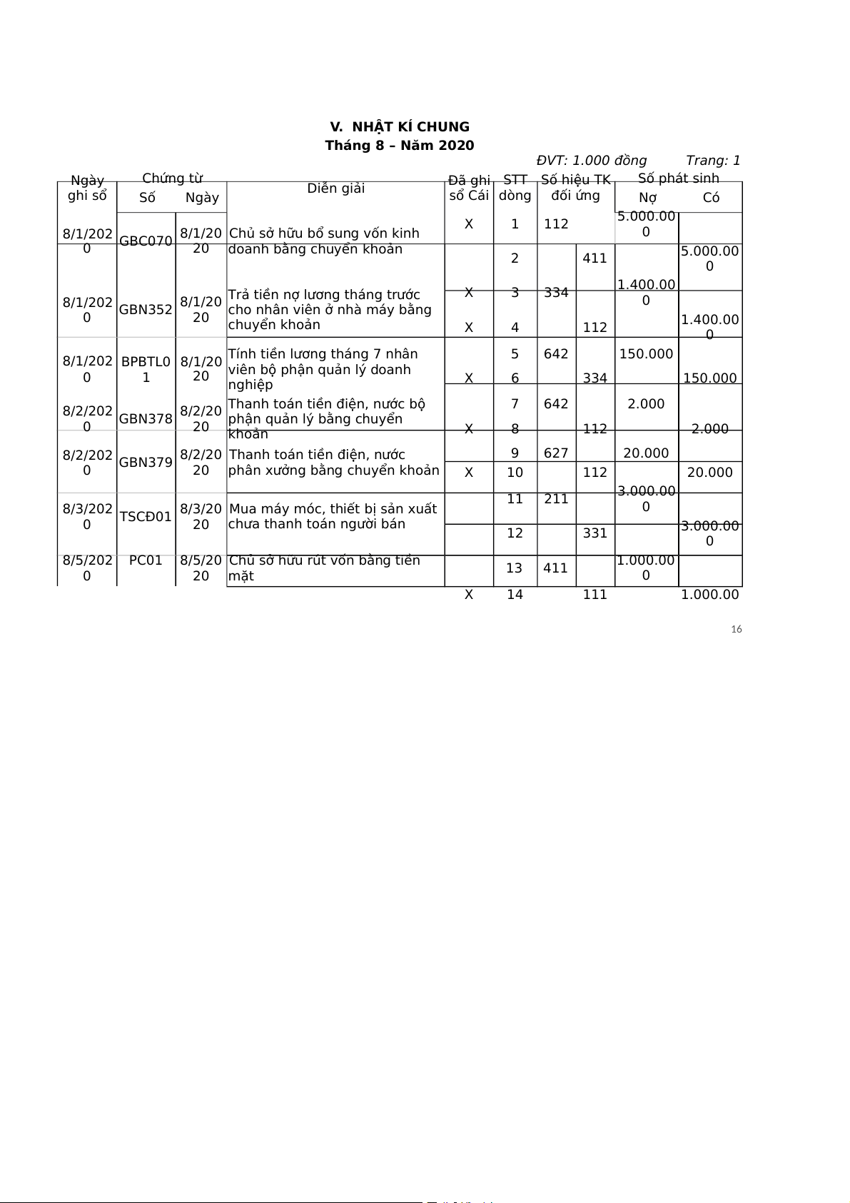 Lợi nhuận = Doanh thu - Chi phí = 9.150.000 – 5.890.000 – 744.750 – 158.200 = 2.357.050 15 V. NHẬT KÍ CHUNG Tháng 8 – Năm 2020 ĐVT: 1.000 đồng Trang: 1 Ngày Chứng từ STT Số hiệu TK Số phát sinh ghi sổ Diễn giải Đã ghi Số Ngày sổ Cái dòng đối ứng Nợ Có X 1 112 5.000.00 8/1/202