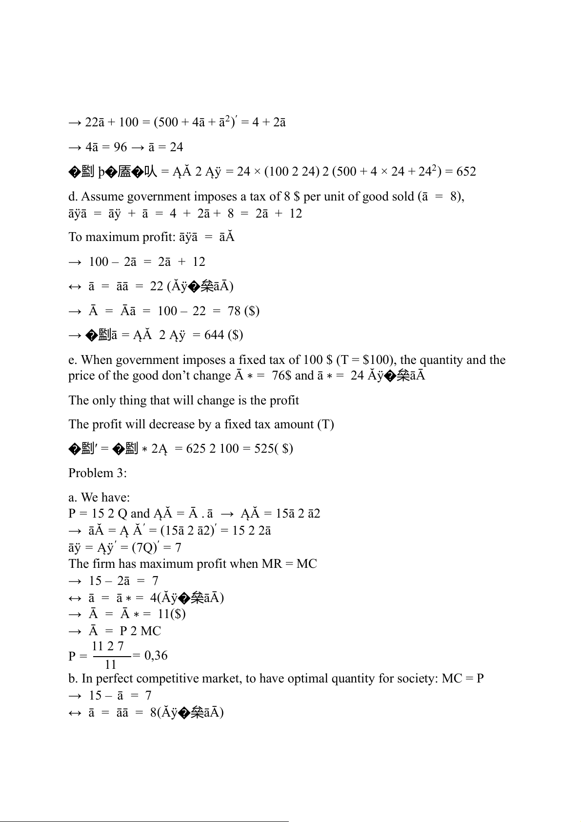 → Profit = π ∗= TR 2 TC = (100.24 – 24^2) – (24^2 + 4.24 + 200) = 952 ($) b. When ā = 0 → M C = 2.0 + 4 = 4 �㕎ÿ� 㕑 Ā = 100 2 0 = 100