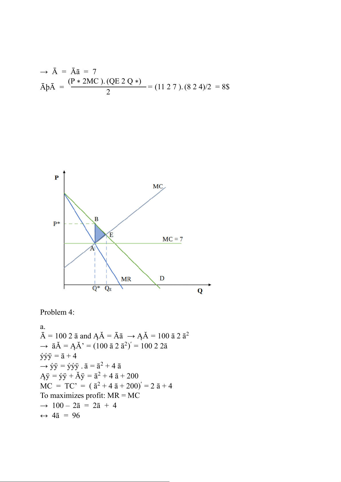 MC = TC’ = ( ā2 + 4 ā + 200)′ = 2 ā + 4 To maximizes profit: MR = MC → 100 – 2ā = 2ā + 4 ↔ 4ā = 96