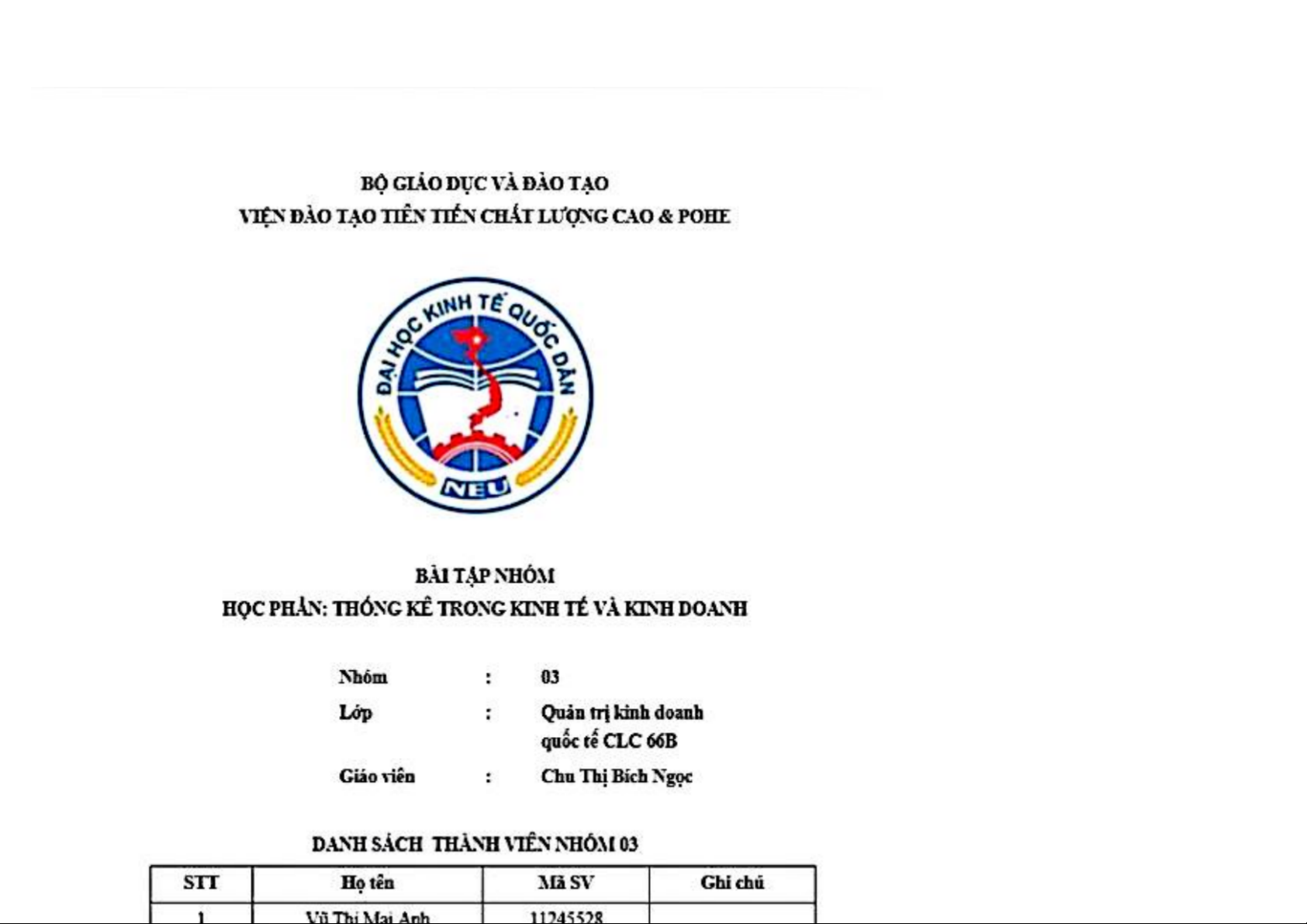 Bài tập nhóm ôn tập thống kê | Thống kê trong kinh tế và kinh doanh | Trường Đại học Kinh tế Quốc dân