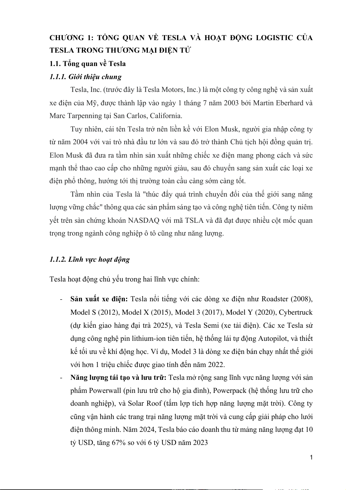 CHƯƠNG 1: TỔNG QUAN VỀ TESLA VÀ HOẠT ĐỘNG LOGISTIC CỦA