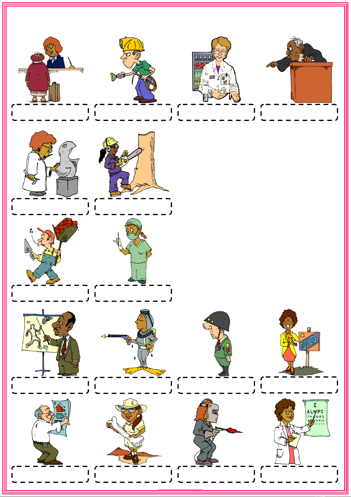 Choose the correct words from the list below and write them under the correct pictures WORD LIST diver welder lumberjack builder receptionist architect surgeon realtor optician soldier sculptor miner archeologist judge lawyer pharmacist