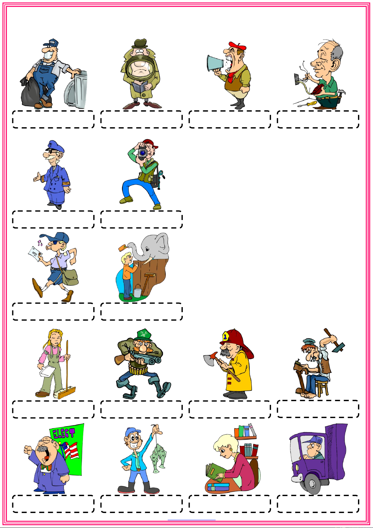 Choose the correct words from the list below and write them under the correct pictures WORD LIST photographer driver cleaner dustman electrician firefighter fisherman postman shoemaker politician captain detective director librarian hunter zookeeper