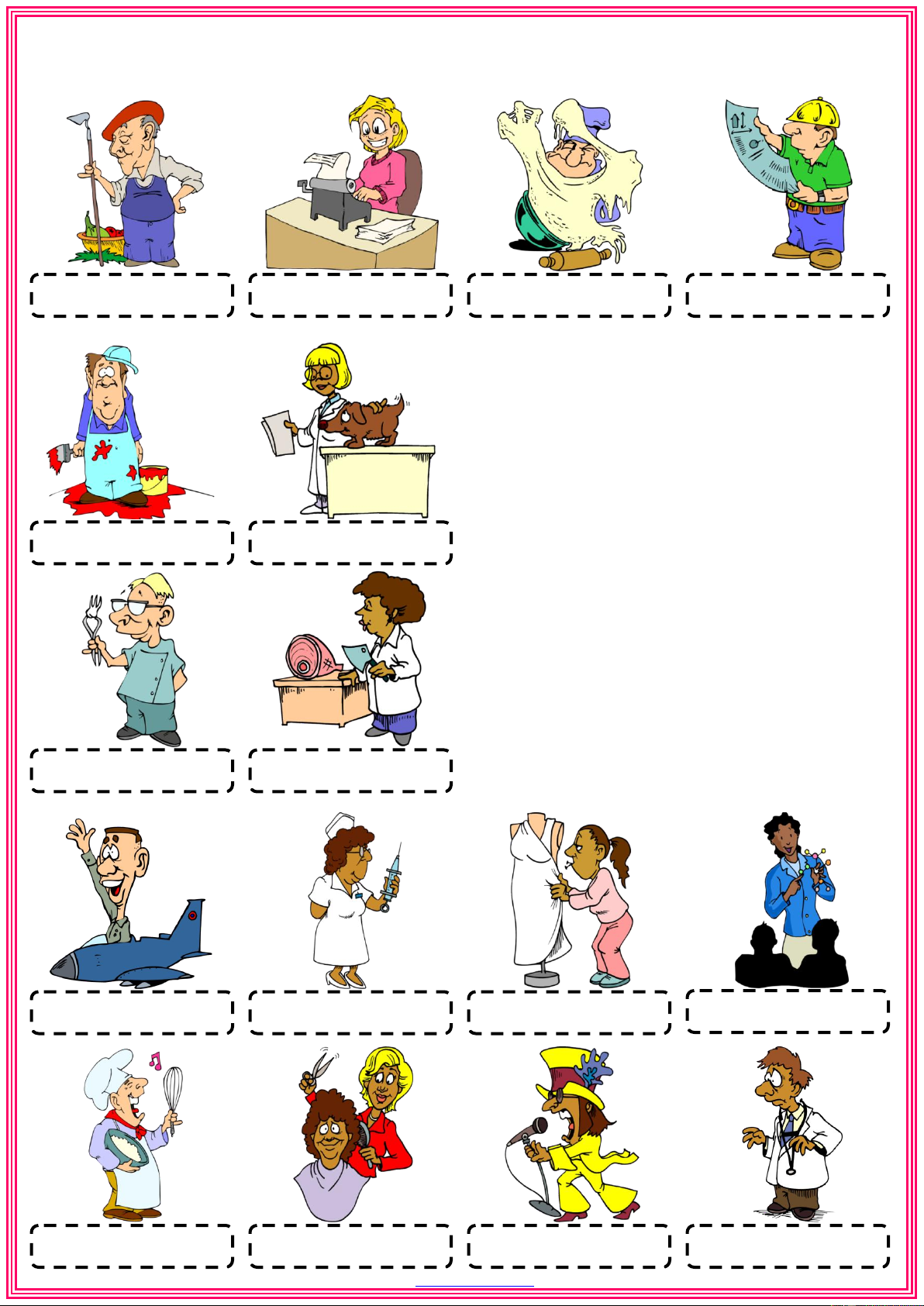 Choose the correct words from the list below and write them under the correct pictures farmer secretary baker engineer WORD LIST doctor dentist nurse vet teacher cook painter vet painter secretary singer butcher farmer engineer tailor baker dentist butcher pilot hairdresser pilot nurse tailor teacher cook hairdresser singer doctor