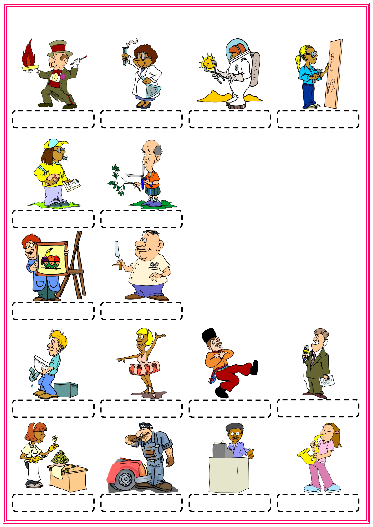 Choose the correct words from the list below and write them under the correct pictures WORD LIST dancer gardener florist magician cashier reporter artist astronaut ballerina musician coach chemist carpenter barber mechanic plumber