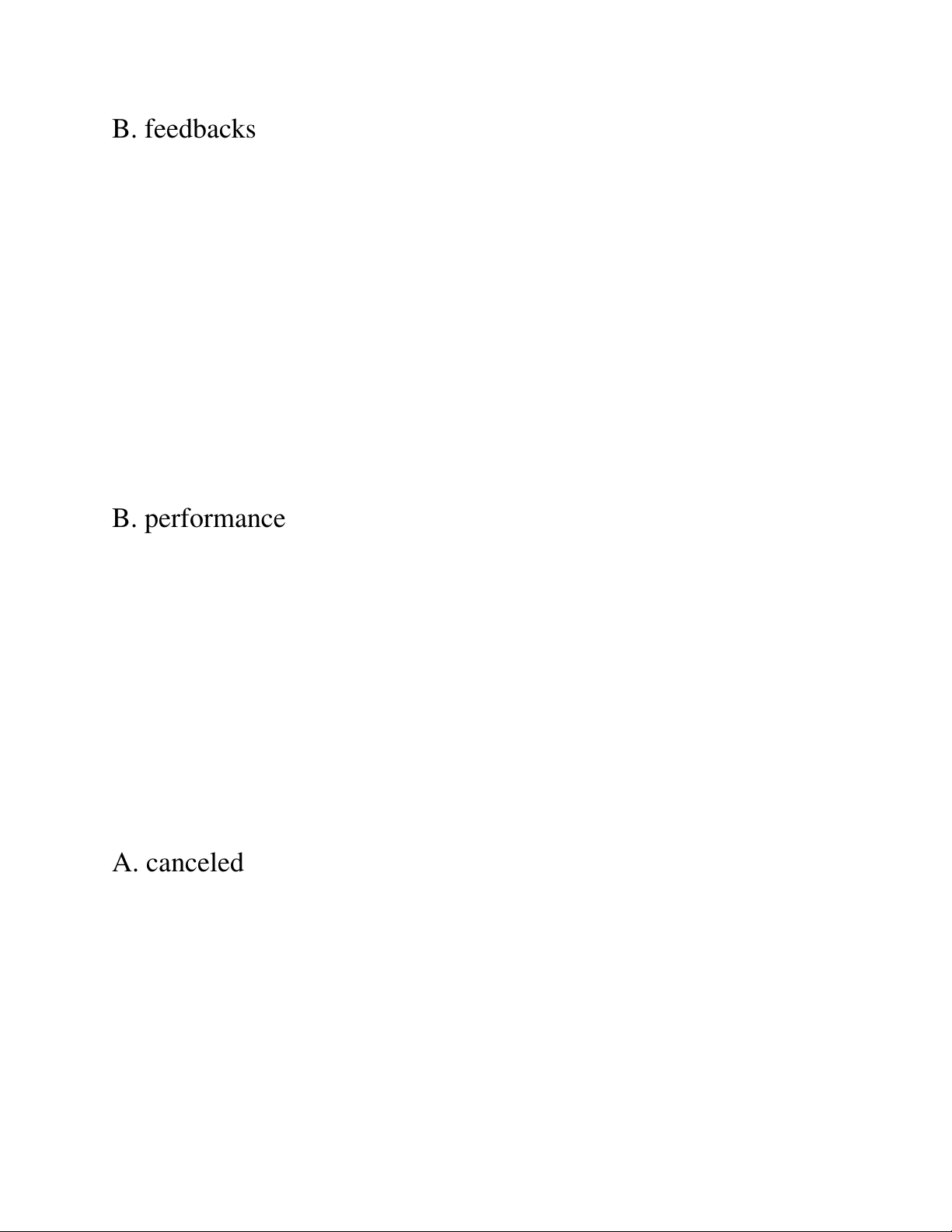 8. She was promoted to assistant manager due to her excellent work _____. A. condition B. performance C. permission D. appearance ⸻