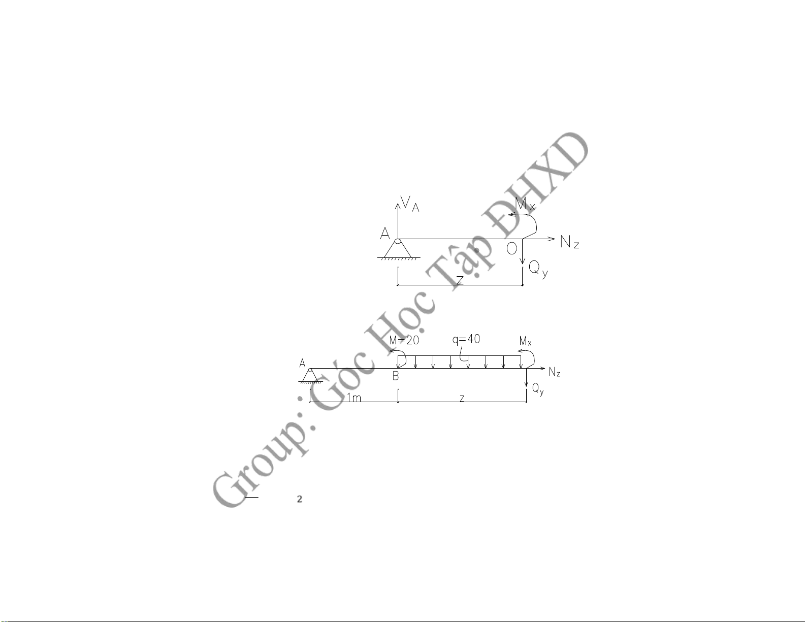 -Đoạn 1: AB ( z € [ 0 ; 1 ] ). Ta có q = 0 → Mx: bậc 1; Qy hằng số ∑ X= 0 → NZ = 0 ∑ Y= 0 →VA = Qy = 50(kN) ∑ mO= 0 → Mx = VA. z +) z= 0 → M A x = 0