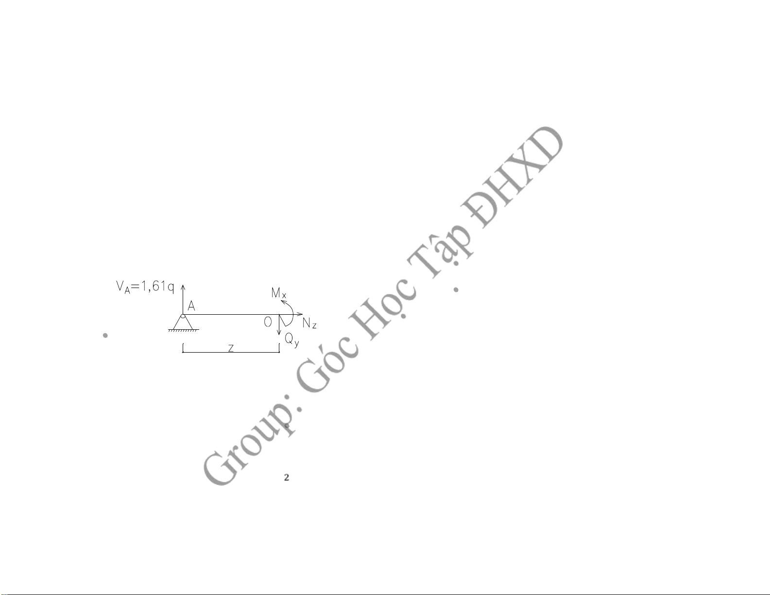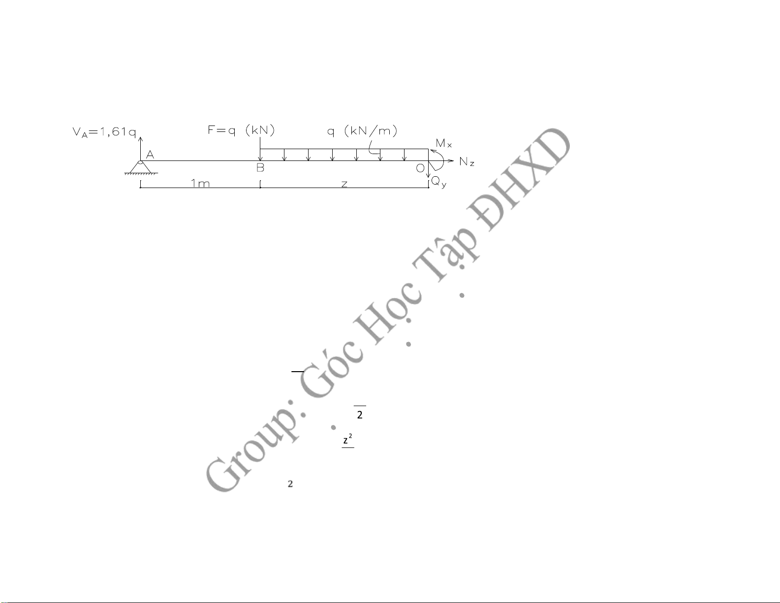 -Đoạn 1: AB với ( 0 ≤ z ≤ 1). Ta có q= 0 -> Mx : hàm bậc 1, Qy : hằng số ∑ X= 0 →NZ = 0 ∑ Y= 0 →VA = Qy =1,61.q ∑ mO= 0 →Mx = VA. z +) z= 0 → M A x = 0