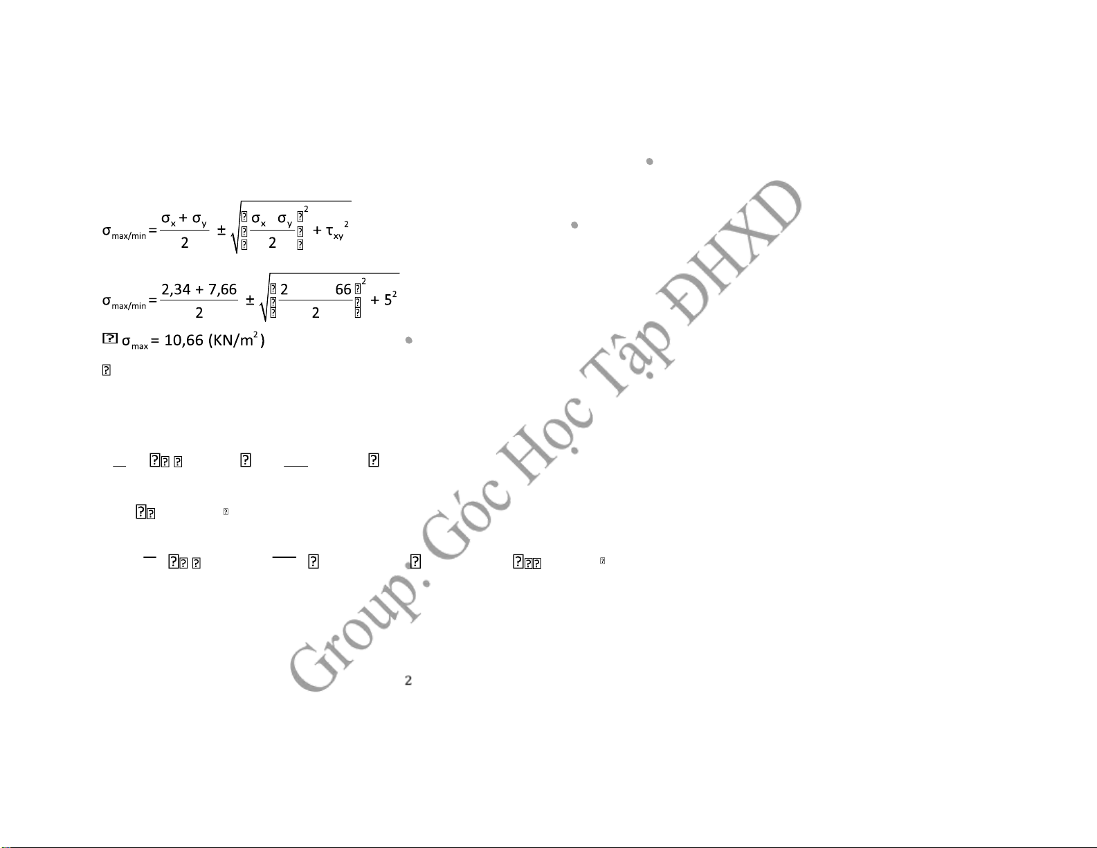 8 = σ +x 6 + σ -x 6.cos2.150 + 3.sin2.150o o 2 2 σ =12,13(x KN/m2 ) -2τ -2.(-3) xy 2, Ta có: tg2α =o = = 0,98 σ -σx y 12,13-6 α =o 22,2o o α =o1 α = 22,o 2 αo2 = 90 + α = 112,o o1 2o σmax/min = σ +x σy σ -x σy 2 2 2 ± 2 + τxy σmax/min =12,36 + 6 ± 12,36 - 2 6 2 + 32 2 σmax = 13,35 (KN/m2 ) σmin = 4,78 (KN/m2 )