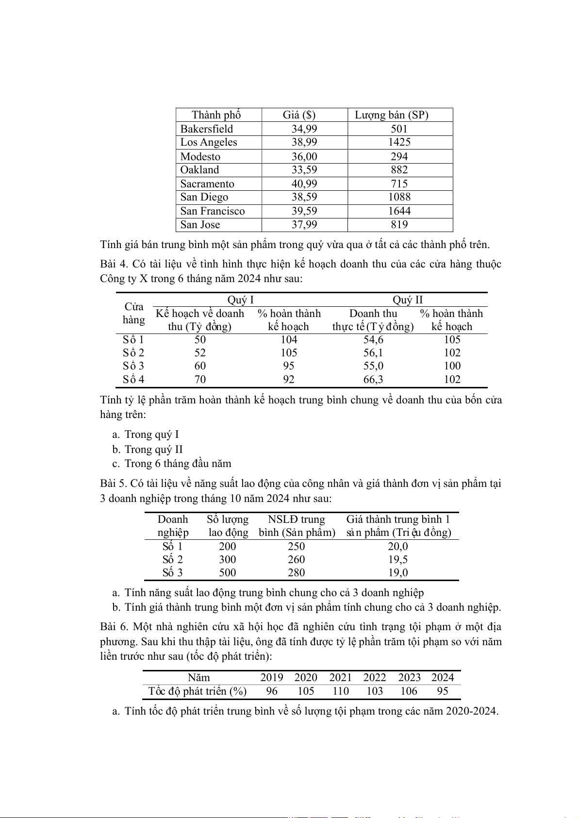 Tính tỷ lệ phần trăm hoàn thành kế hoạch trung bình chung về doanh thu của bốn cửa hàng trên: a. Trong quý I b. Trong quý II c. Trong 6 tháng đầu năm