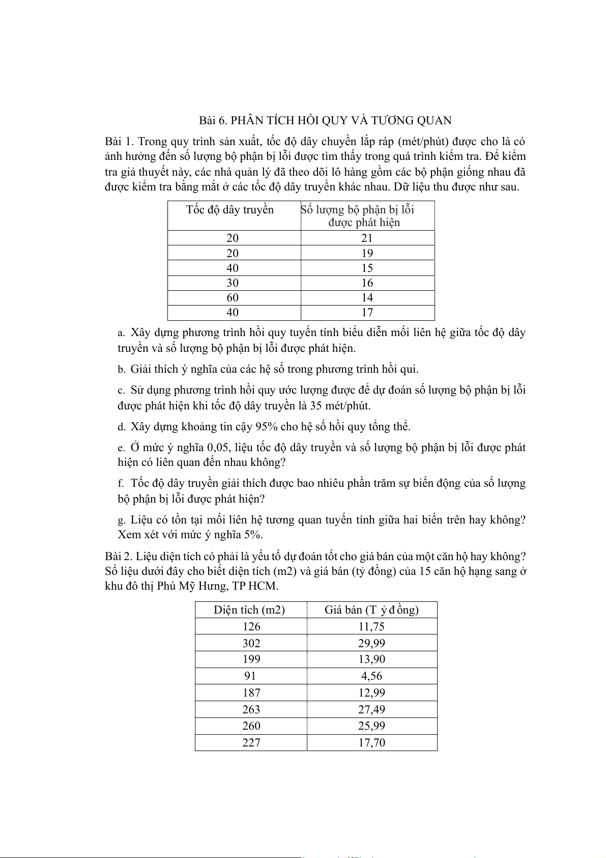 Số liệu dưới đây cho biết diện tích (m2) và giá bán (tỷ đồng) của 15 căn hộ hạng sang ở