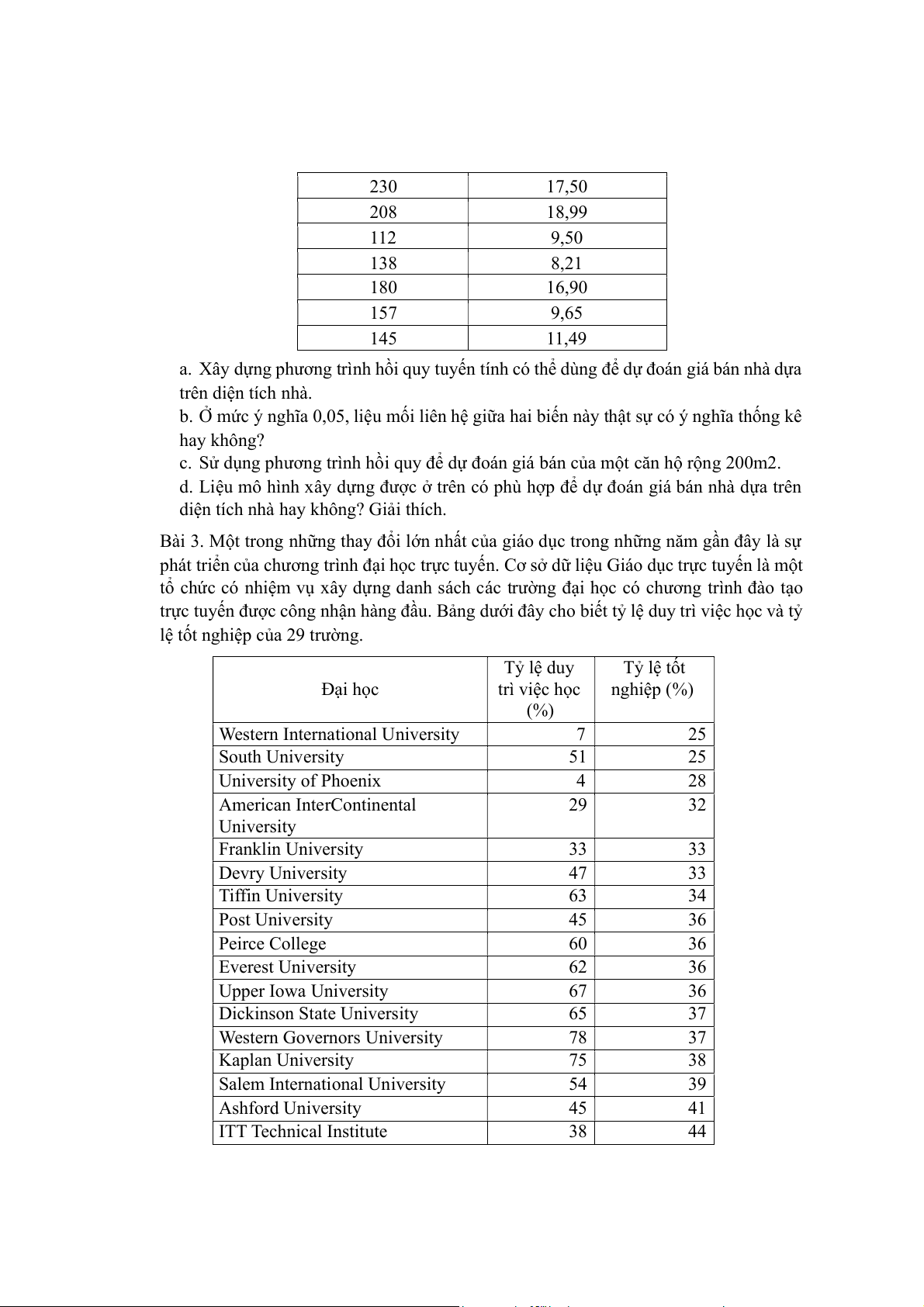 a. Xây dựng phương trình hồi quy tuyến tính biểu diễn mối liên hệ giữa tỷ lệ duy trì