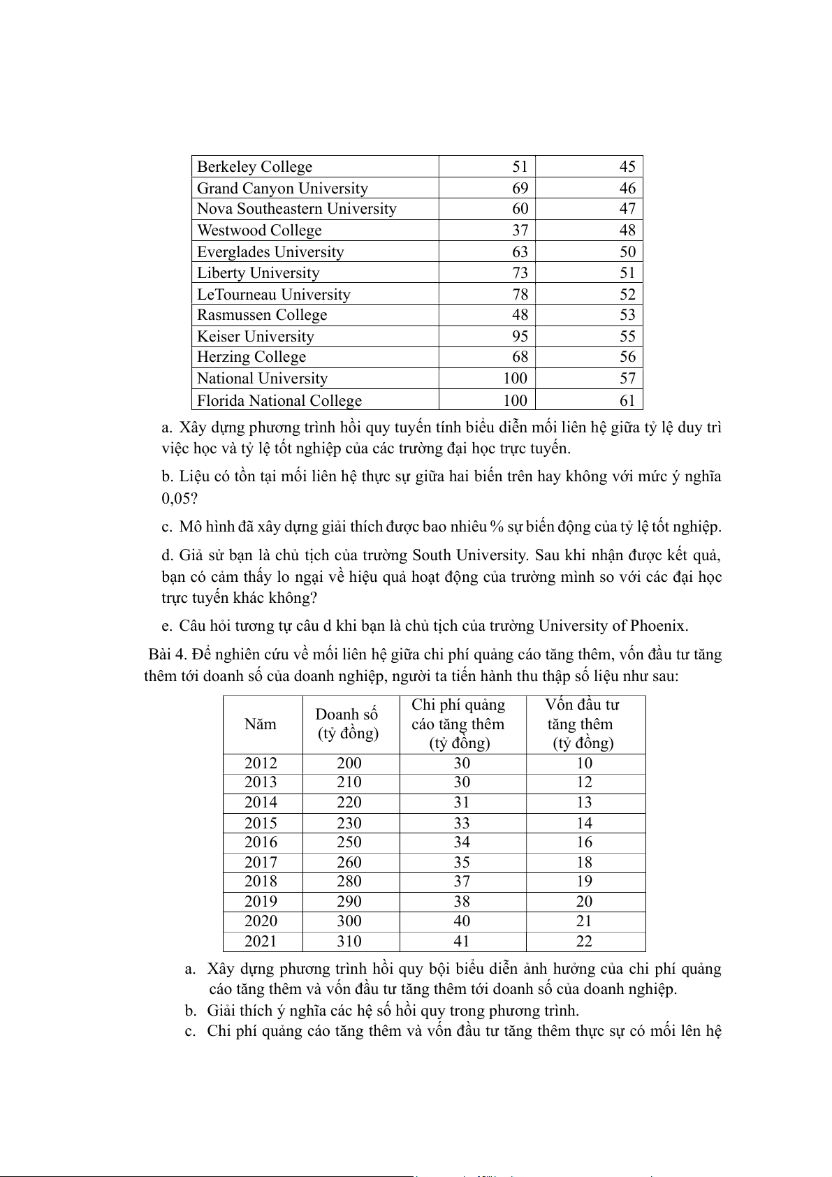 Bài 4. Để nghiên cứu về mối liên hệ giữa chi phí quảng cáo tăng thêm, vốn đầu tư tăng