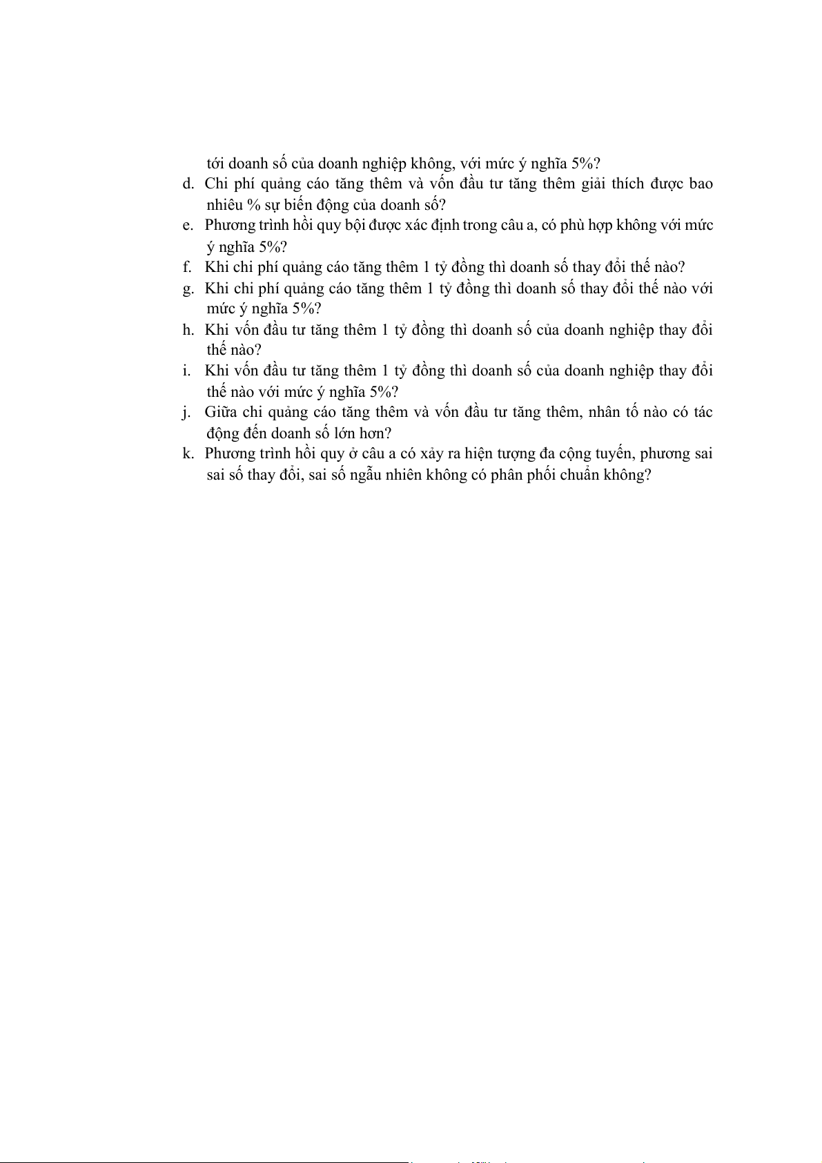 h. Khi vốn đầu tư tăng thêm 1 tỷ đồng thì doanh số của doanh nghiệp thay đổi thế nào?