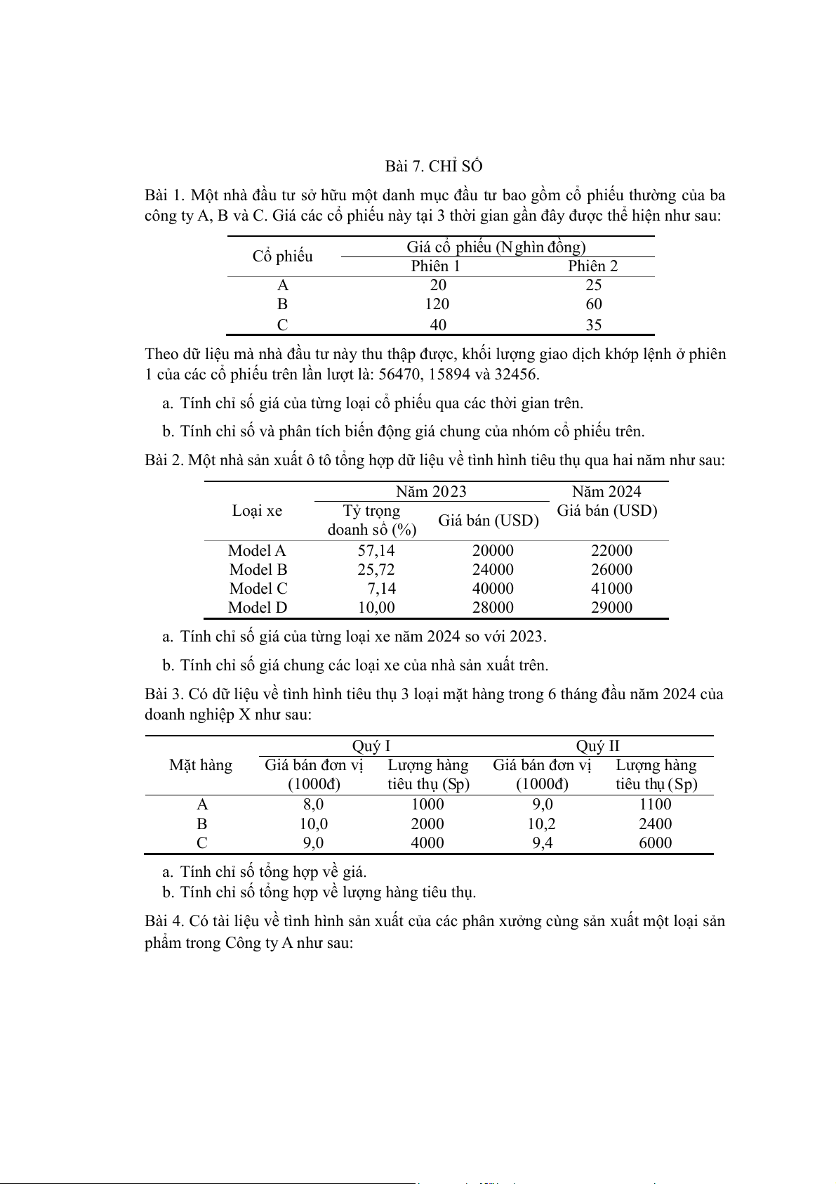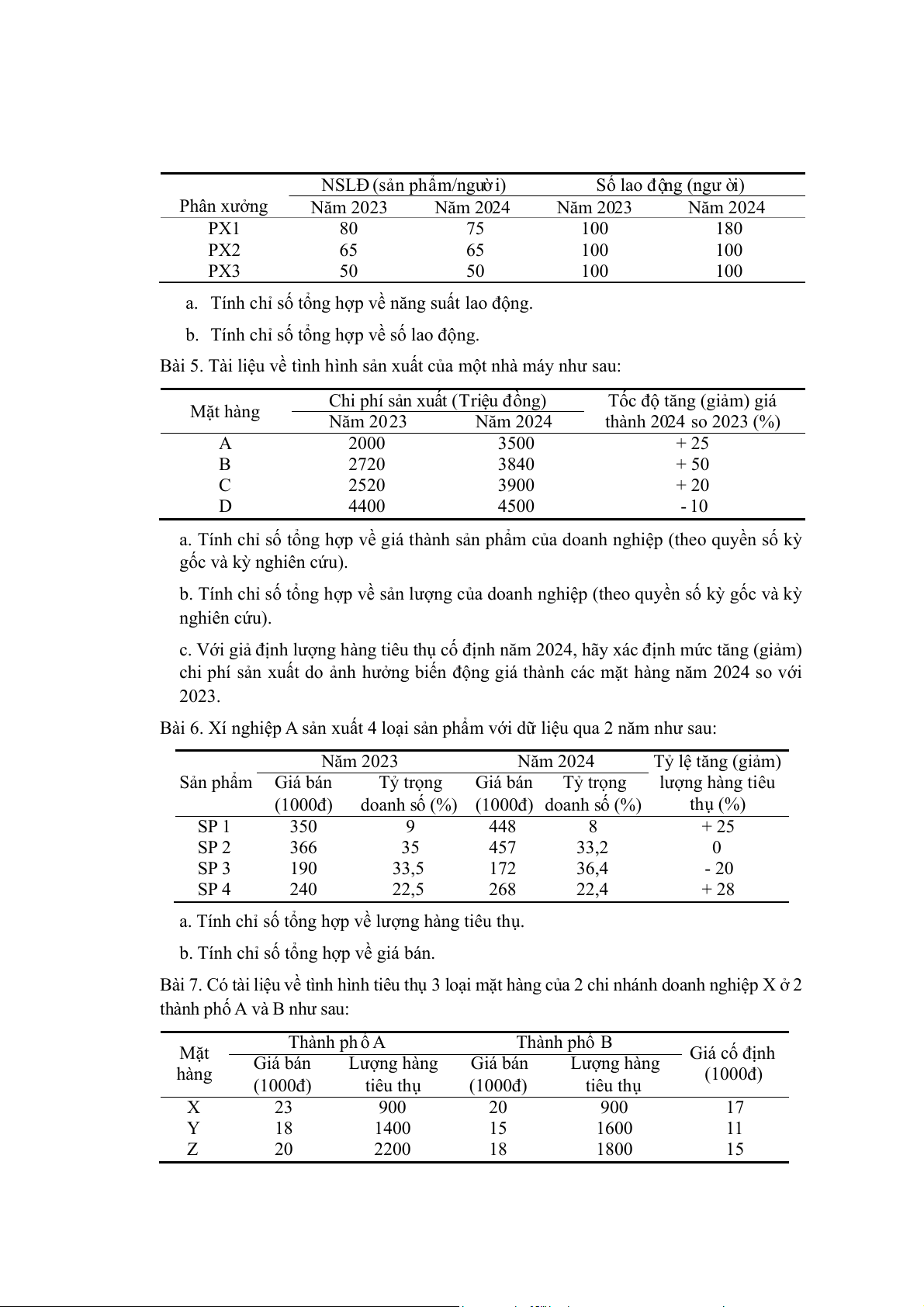 Bài 6. Xí nghiệp A sản xuất 4 loại sản phẩm với dữ liệu qua 2 năm như sau: Năm 2023 Năm 2024 Tỷ lệ tăng (giảm) Sản phẩm Giá bán Tỷ trọng Giá bán Tỷ trọng lượng hàng tiêu (1000đ)
