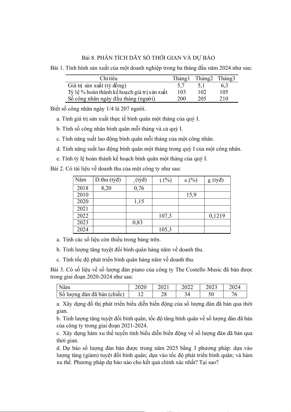 Bài 2. Có tài liệu về doanh thu của một công ty như sau: Năm D.thu (tỷđ) (tỷđ) t (%) a (%) g (tỷđ) i i i i 2018 8,20 0,76 2010 15,9 2020 1,15 2021 2022 107,3 0,1219 2023 0,83 2024 105,3