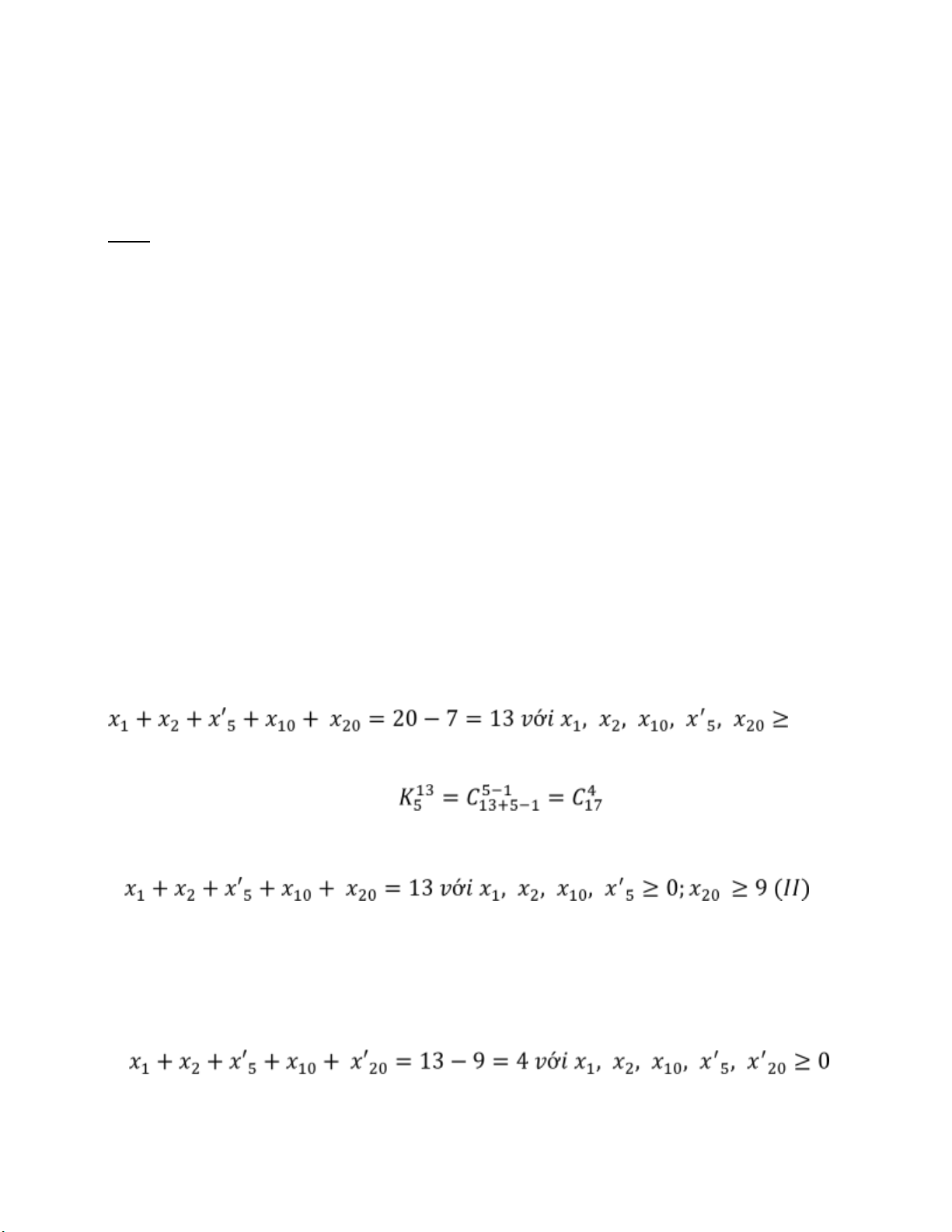 Số cÆch chọn thỏa yŒu cầu của đề bài cũng l số nghiệm nguyŒn của phương trnh (1). Đổi biến: 𝑥′5 = 𝑥5 − 7 ≥ 0 Xét phương trình: 0 (𝐼)