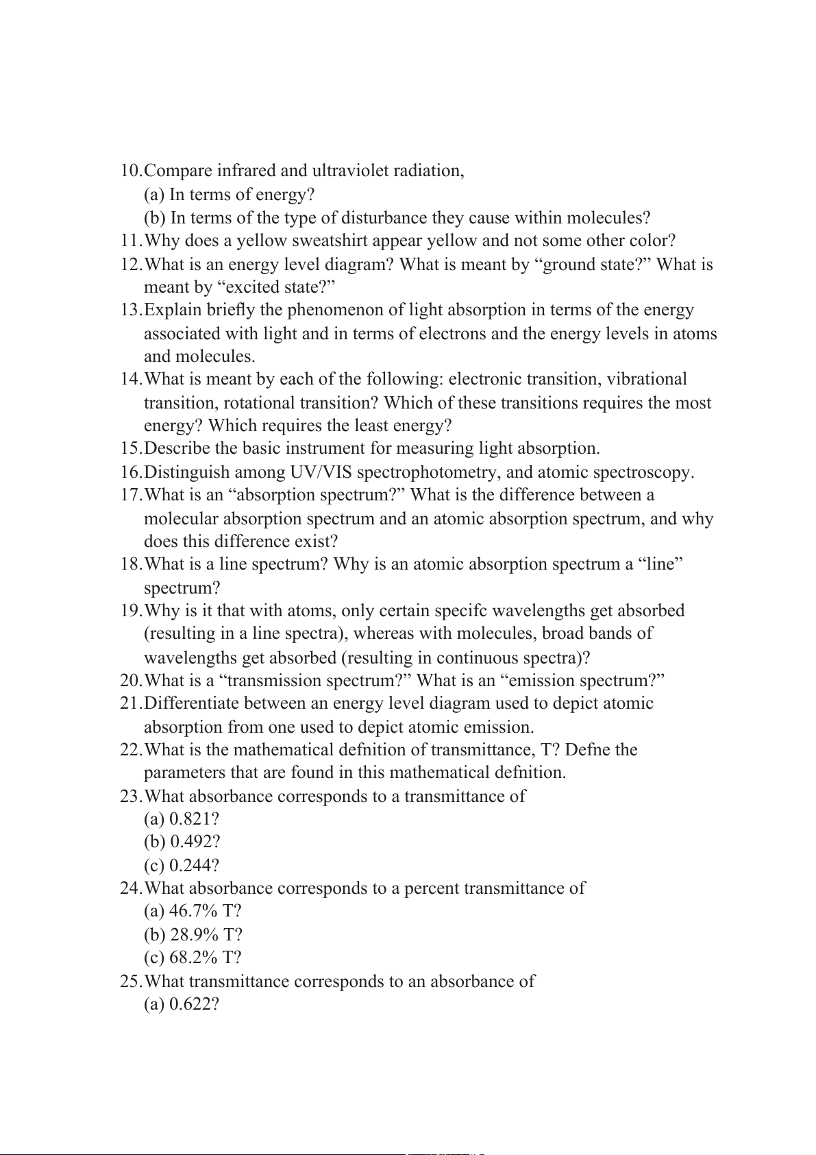 24.What absorbance corresponds to a percent transmittance of (a) 46.7% T? (b) 28.9% T? (c) 68.2% T?
