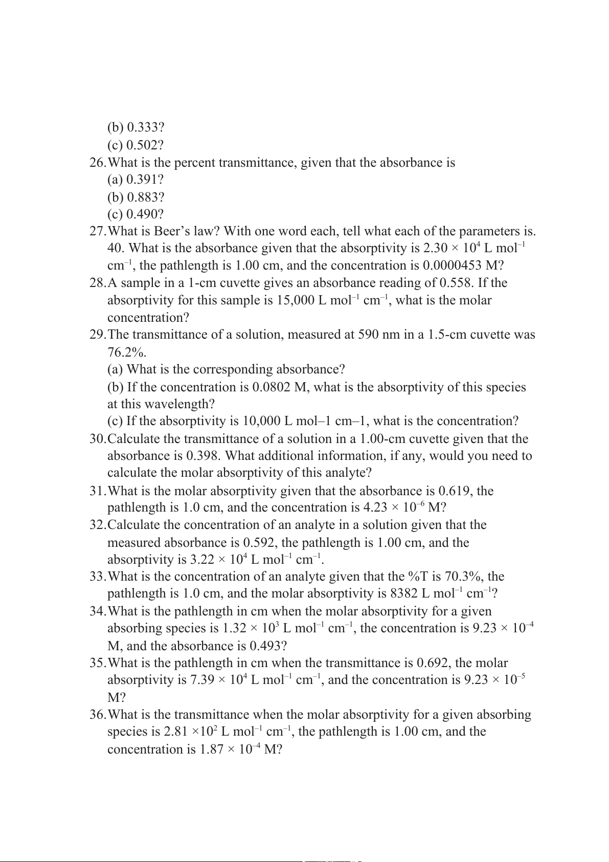 26.What is the percent transmittance, given that the absorbance is (a) 0.391? (b) 0.883? (c) 0.490?