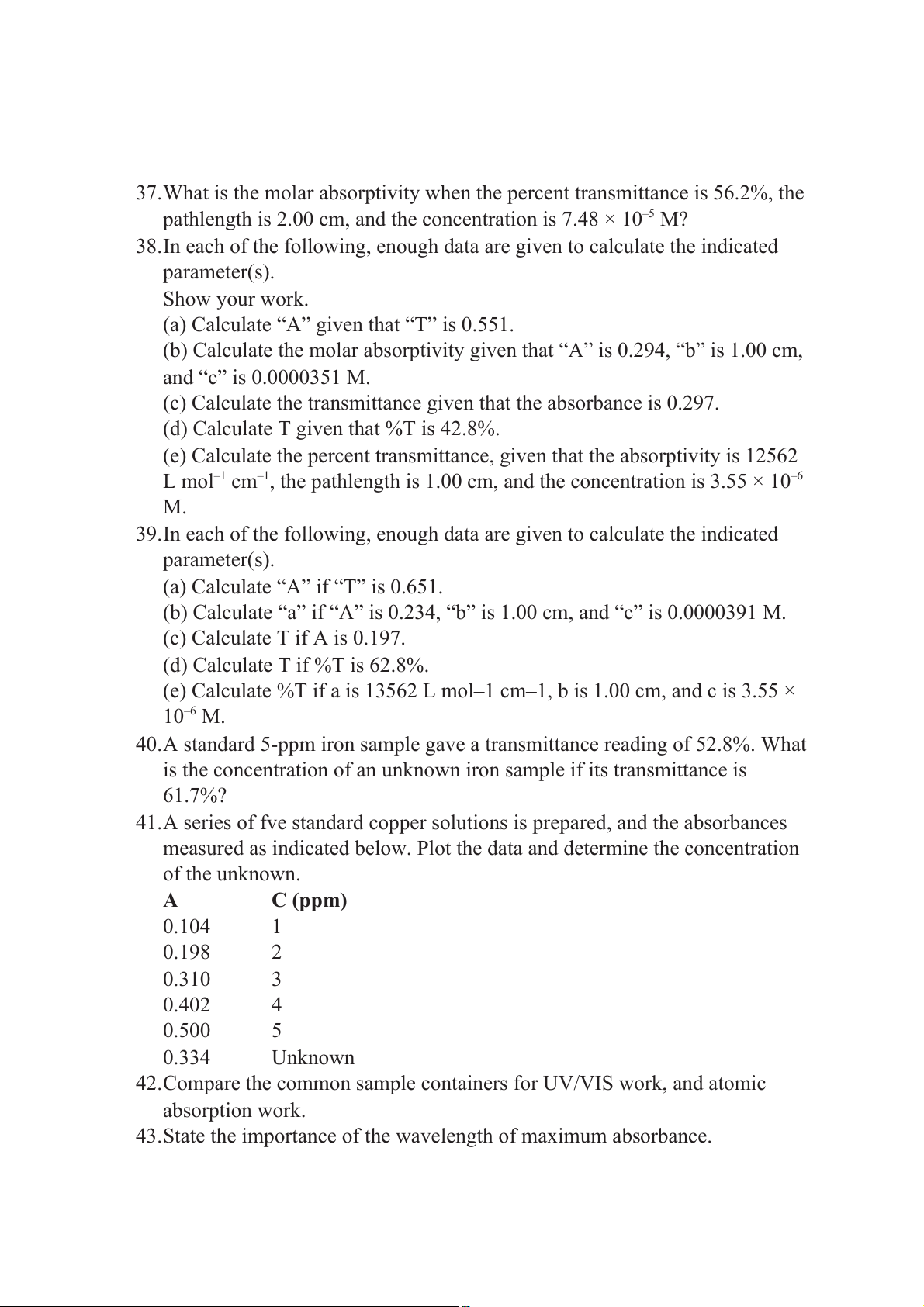 29.The transmittance of a solution, measured at 590 nm in a 1.5-cm cuvette was 76.2%.