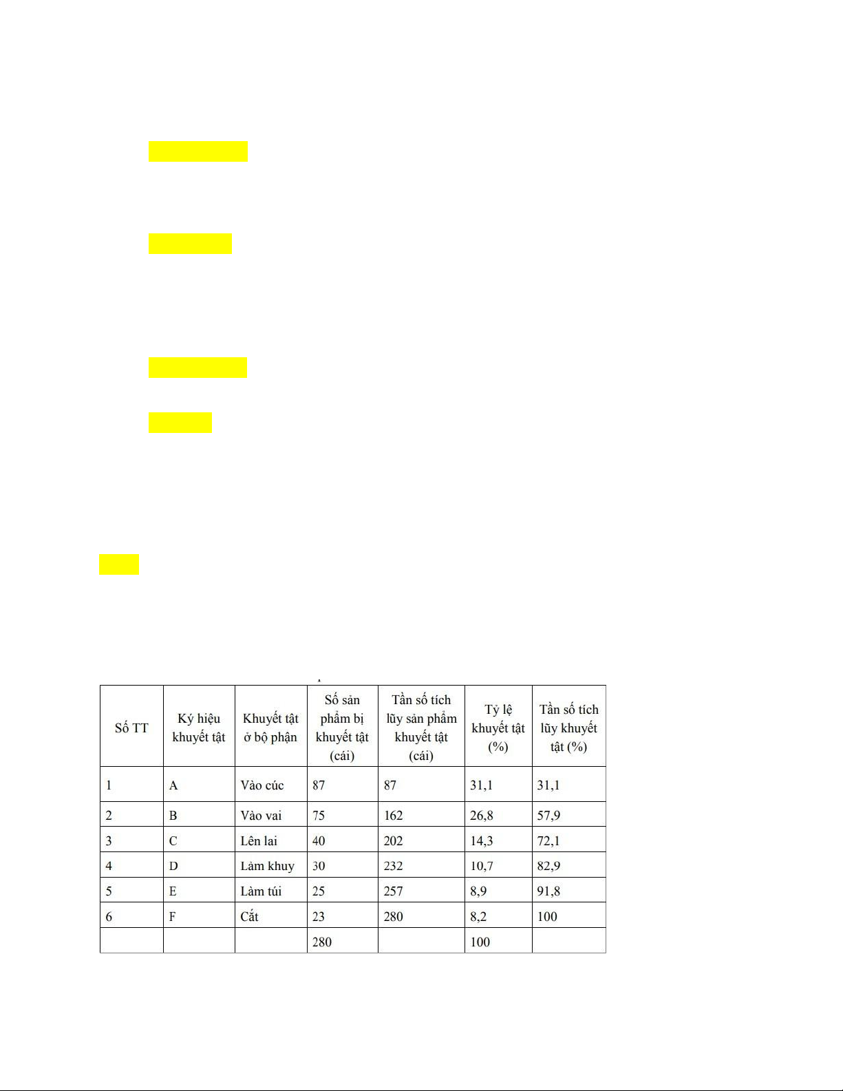 động cơ và thu được dữ liệu như sau: Stt Nguyên nhân Số lần 1 Khuyết tật về sơn 35 2 Khuyết tật về hàn 50 3 Khuyết tật về đúc 44 4 Khuyết tật về dập 29 5 Khuyết tật về lắp ráp 79 6