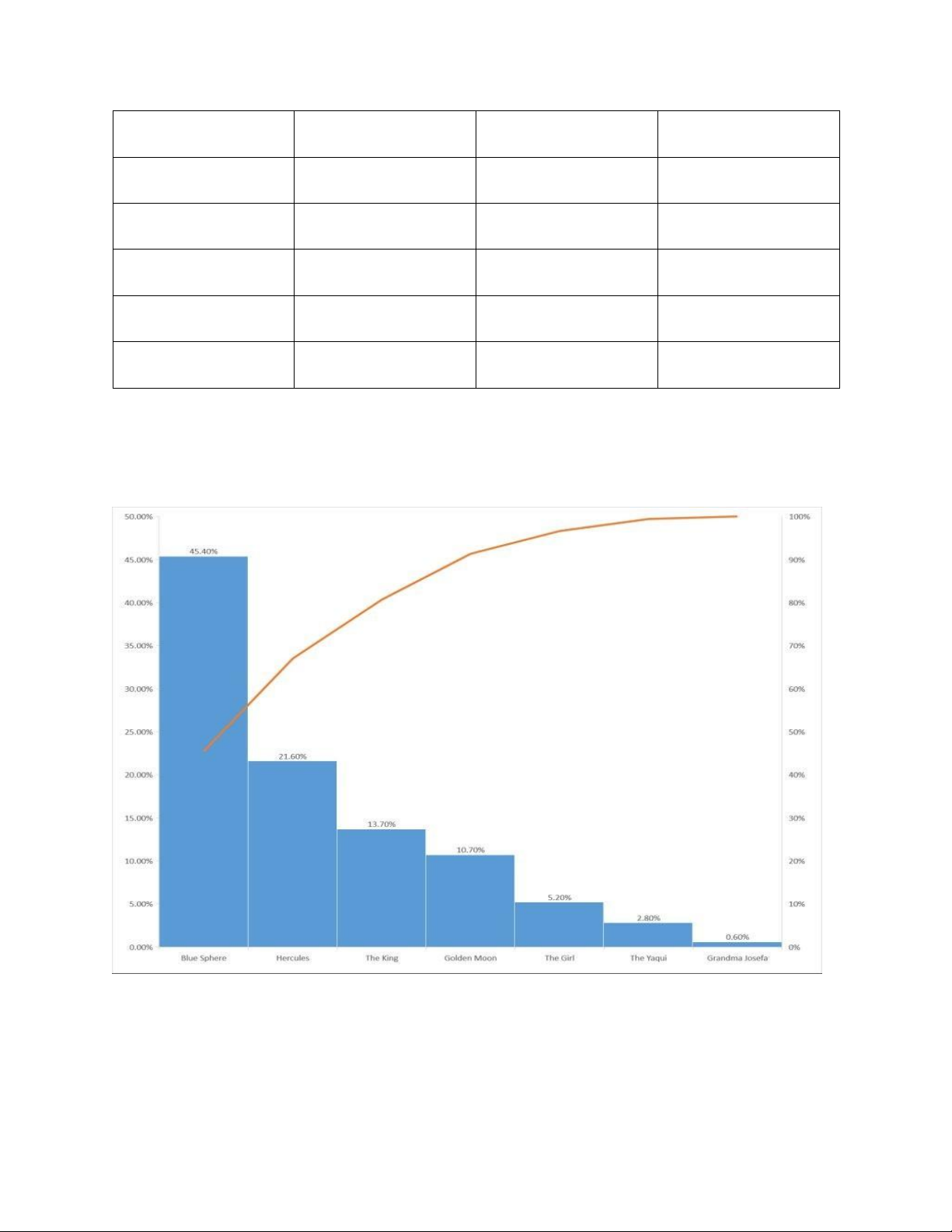 Doanh thu (nghìn $) Tỷ lệ phần trăm Tỷ lệ phần trăm tần số tích lũy Blue Sphere $72,858.00 45.40% 45.40% Hercules $34,716.00 21.60% 67.00% The King $22,085.00 13.70% 80.70% Golden Moon $17,131.00 10.70% 91.40% The Girl $8,370.00 5.20% 96.60% The Yaqui $4,511.00 2.80% 99.40% Grandma Josefa $980.00 0.60% 100.00%