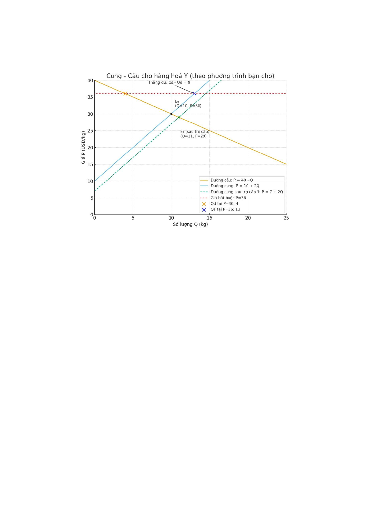 2. Nếu chính phủ áp đặt giá P=36 USD/kg > 30 USD (giá cân bằng) - Qd=40−36=4 (kg)