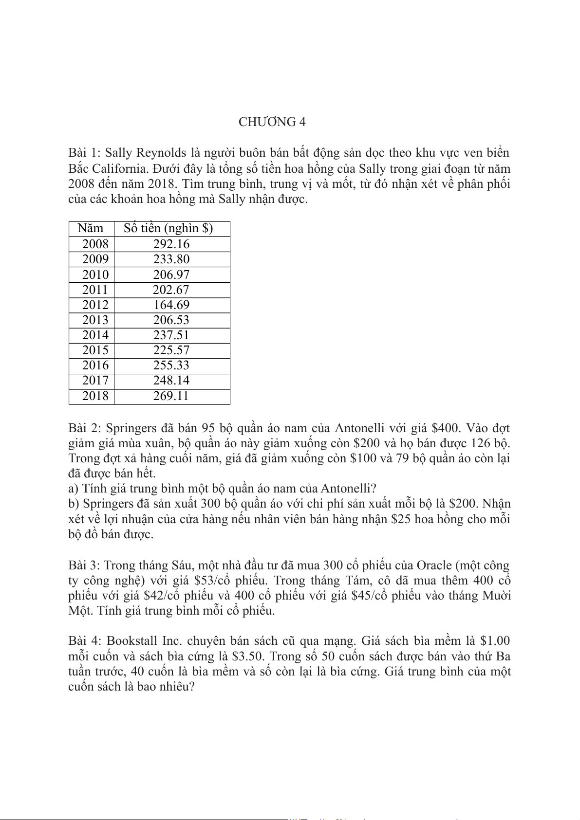 của các khoản hoa hồng mà Sally nhận được. Năm Số tiền (nghìn $) 2008 292.16 2009 233.80 2010 206.97 2011 202.67 2012 164.69 2013 206.53 2014 237.51 2015 225.57 2016 255.33 2017 248.14 2018 269.11