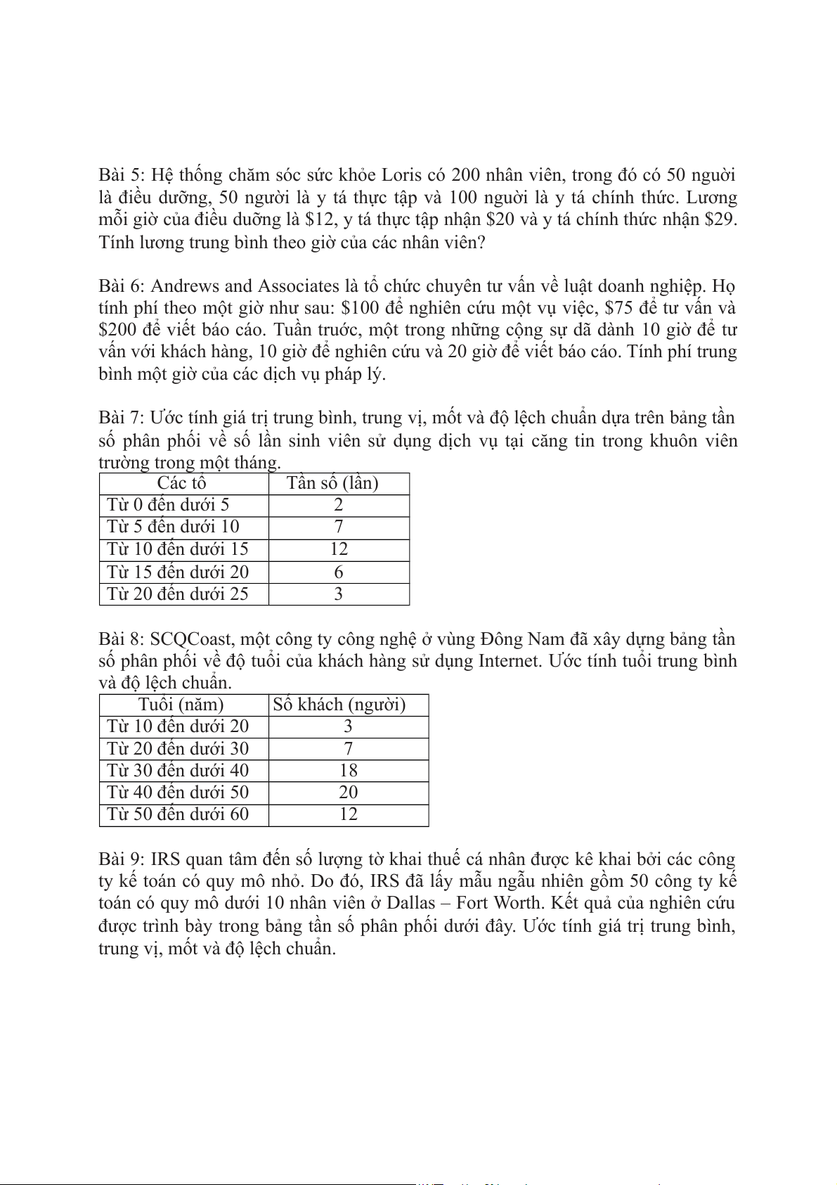 số phân phối về độ tuổi của khách hàng sử dụng Internet. Ước tính tuổi trung bình và độ lệch chuẩn. Tuổi (năm) Số khách (người) Từ 10 đến dưới 20 3 Từ 20 đến dưới 30 7 Từ 30 đến dưới 40 18 Từ 40 đến dưới 50 20 Từ 50 đến dưới 60 12