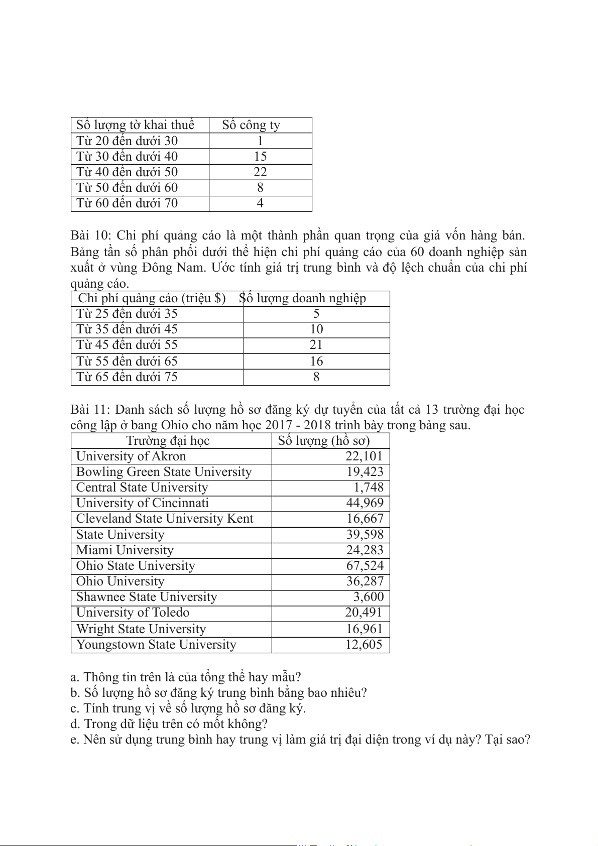 trung vị, mốt và độ lệch chuẩn. Số lượng tờ khai thuế Số công ty Từ 20 đến dưới 30 1 Từ 30 đến dưới 40 15 Từ 40 đến dưới 50 22 Từ 50 đến dưới 60 8 Từ 60 đến dưới 70 4