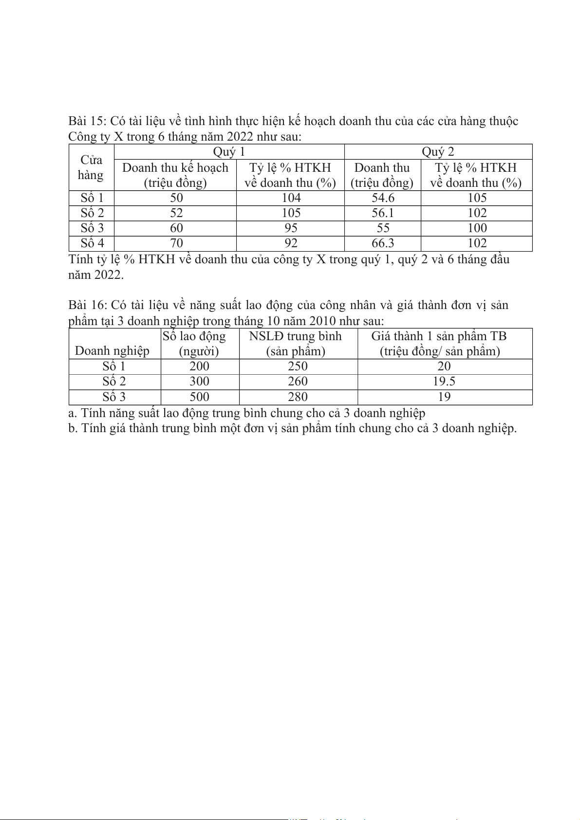 Bài 15: Có tài liệu về tình hình thực hiện kế hoạch doanh thu của các cửa hàng thuộc