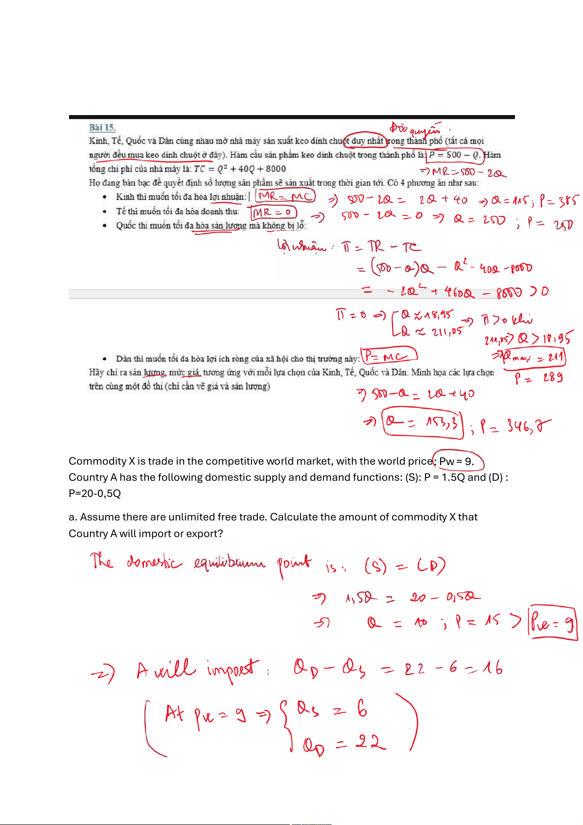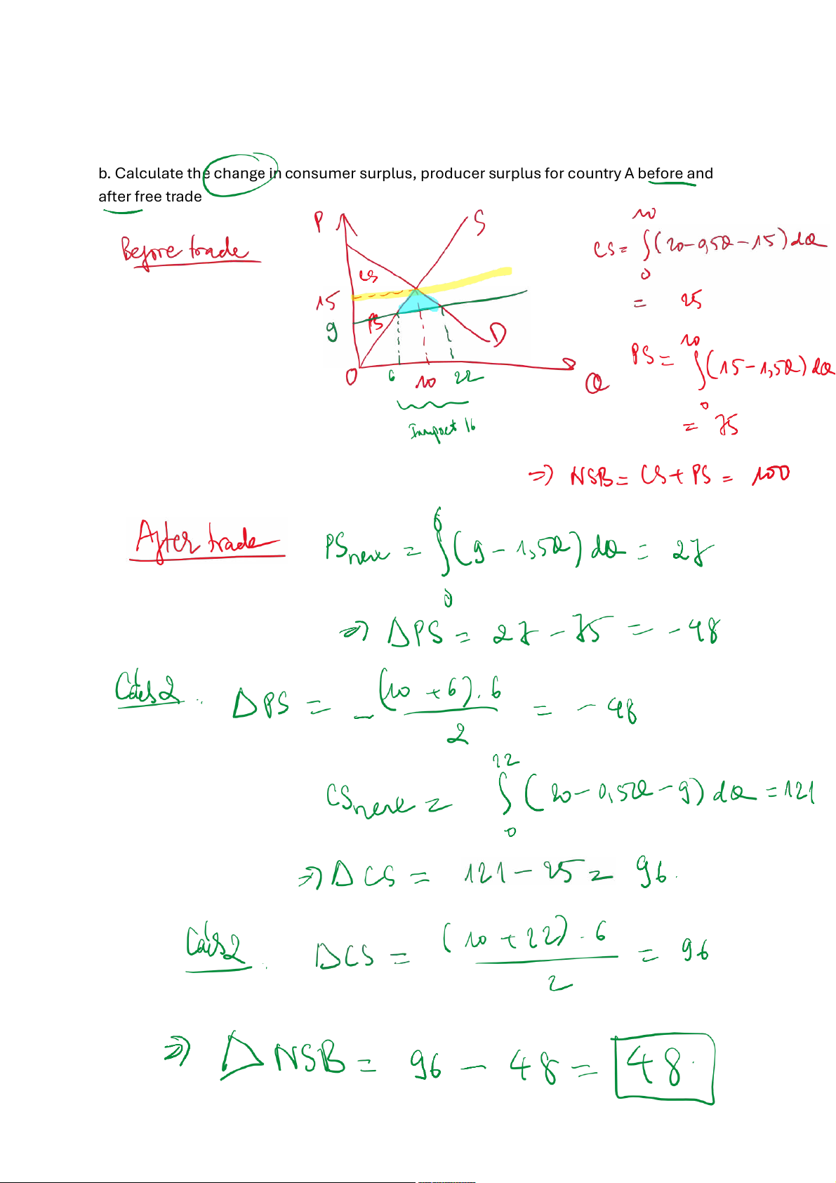 Country A has the following domestic supply and demand functions: (S): P = 1.5Q and (D) : P=20-0,5Q