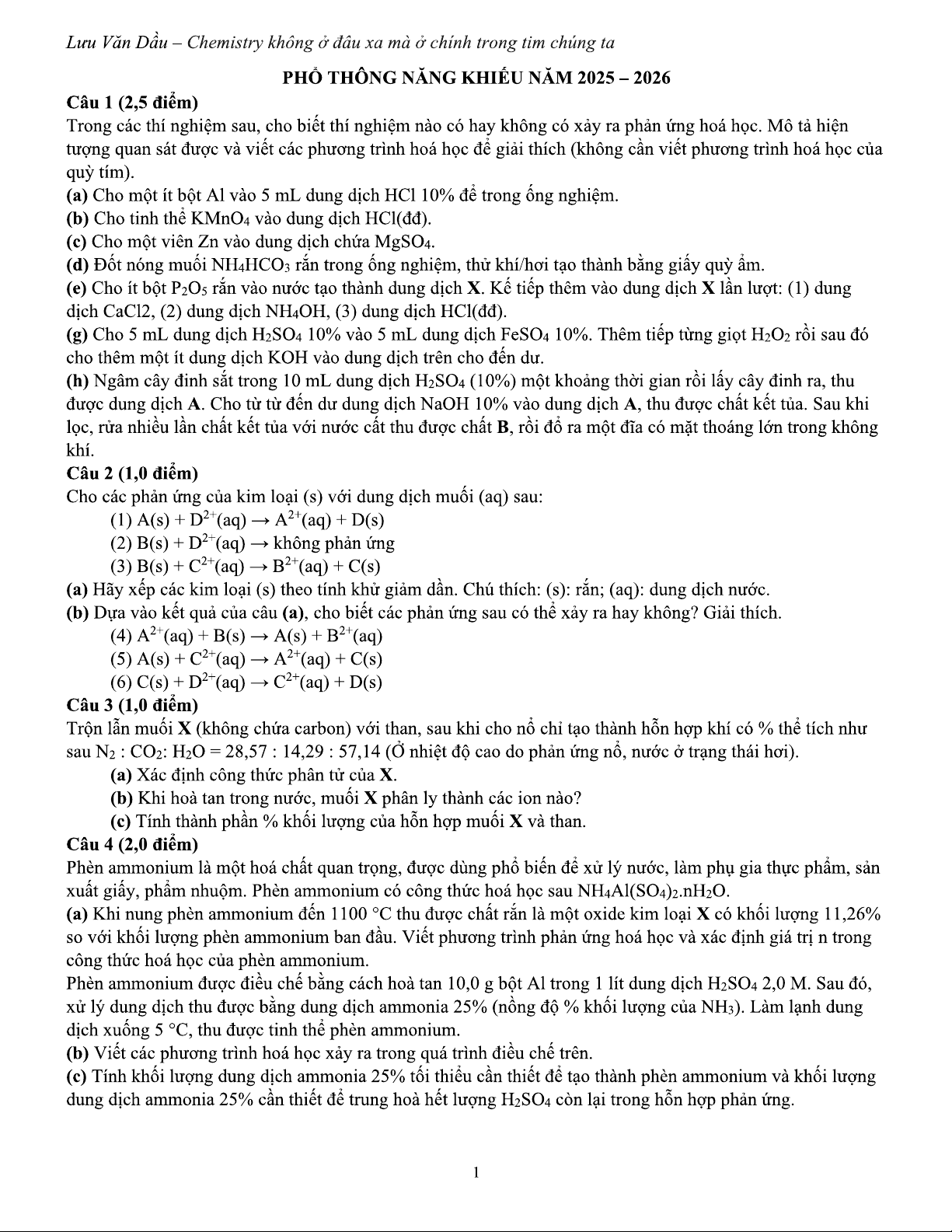 Bài tập Phổ thông năng khiếu năm 2025 – 2026 môn Hoá học lớp 9