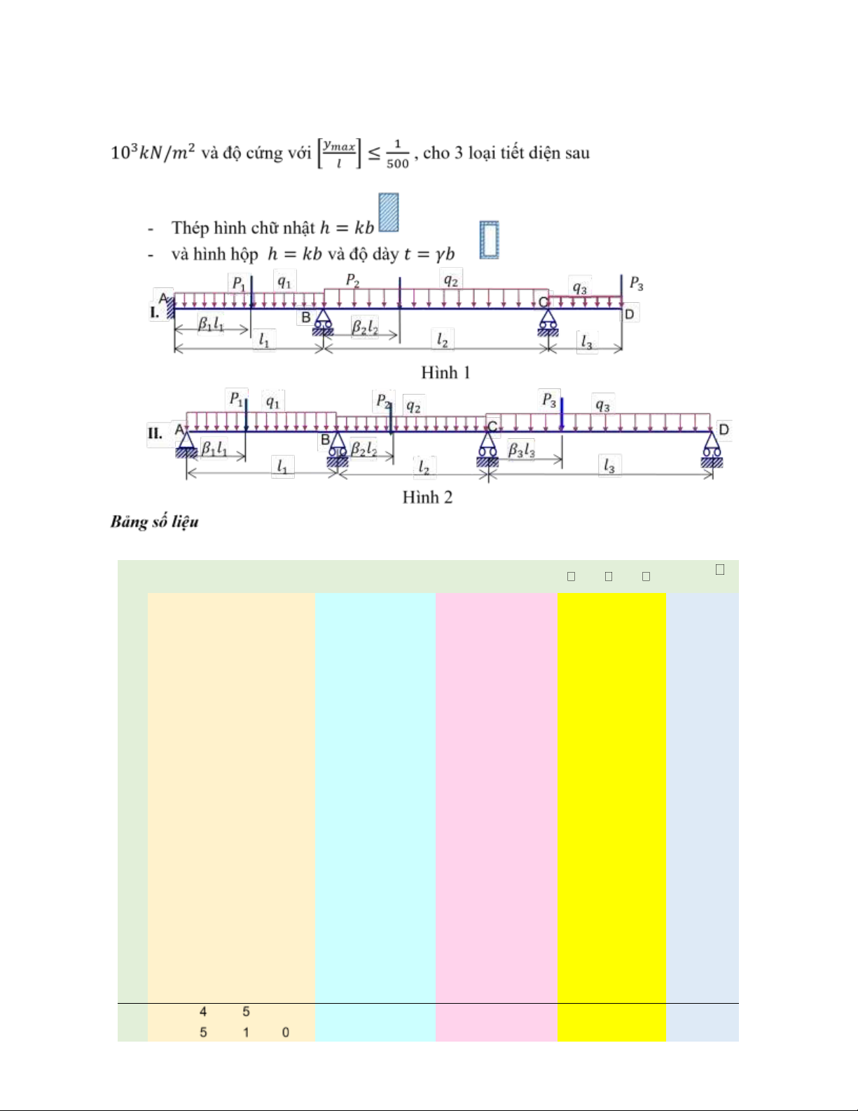 mô đun 𝐸 = 2 ∙ 10 𝑘𝑁/𝑚 . Chọn kích thước tiết diện theo độ bền với [𝜎] = 160 ∙ thép hình chữ I TT l1 l2 (m) l3 P1 P2 (kN) P3 q1 q2 (kN/m) q3 1 2 3 k 1 5 4 4 60 0 0 0 25 15 1/3 0 0 2 0.1 2 5 6 5 0 50 0 20 0 20 0 2/3 0 3 0.08 3 7 5 5 0 0 50 20 20 0 0 0 1/3 2.5 0.12 4 4 6 4 0 60 40 20 0 0 0 1/3 2/3 2 0.15 5 6 4 4 60 0 40 0 20 0 1/4 0 1/2 3 0.1 6 6 6 5 60 50 0 0 0 15 2/3 1/3 0 2.5 0.08 7 4 6 4 0 60 40 20 0 0 0 2/3 1/3 2 0.12 8 5 6 5 0 50 0 20 0 20 0 1/3 0 3 0.15 9 7 5 5 0 0 60 20 20 0 0 0 1/2 2.5 0.1 10 4 6 4 0 60 40 20 0 0 0 2/3 1/3 2 0.08 11 6 4 4 60 0 40 0 20 0 3/4 0 1/4 3 0.12 12 6 6 5 60 50 0 0 0 15 1/3 2/3 0 2.5 0.15 13 5 4 4 60 0 0 0 25 15 2/3 0 0 2 0.1 14 5 6 5 0 60 40 20 0 0 0 1/3 1/3 3 0.08 15 6 4 5 60 0 40 0 20 0 1/4 0 1/3 2.5 0.12 16 6 7 4 60 50 0 0 0 15 2/3 1/3 0 2 0.15 17 4 6 4 0 60 40 20 0 0 0 2/3 ¼ 3 0.1 18 6 3 5 60 0 40 0 20 0 3/4 0 1/3 2.5 0.08 19 4 6 4 60 50 0 0 0 15 1/3 2/3 0 2 0.12 60 0 0 0 25 15 1/3 0 0 3 0.15 50 0 20 0 20 0 2/3 0 2.5 0.1 lOMoAR cPSD| 58833082 22 6 5 2 0 0 50 20 20 0 0 0 1 2 0.08 23 4 6 1.5 0 60 40 20 0 0 0 2/3 1 3 0.12 24 5 4 2 60 0 0 0 25 15 2/3 0 0 2.5 0.15 TT l1 l2 (m) l3 P1 P2 (kN) P3 q1 q2 (kN/m) q3 1 2 3 k 25 6 6 1 0 50 0 20 0 20 0 1/3 0 2 0.1 26 4 5 1.5 0 0 40 20 20 0 0 0 1 3 0.08 27 4 6 2 0 60 40 20 0 0 0 2/3 1 2.5 0.12 28 5 6 1.5 0 50 0 20 0 20 0 1/3 0 2 0.15 29 7 5 2 0 0 60 20 20 0 0 0 1 3 0.1 30 4 6 1 0 60 40 20 0 0 0 2/3 1 2.5 0.08 31 6 4 1.5 60 0 40 0 20 0 3/4 0 1 2 0.12 32 6 6 2 60 50 0 0 0 15 1/3 2/3 0 3 0.15 33 5 4 1.5 60 0 0 0 25 15 2/3 0 0 2.5 0.1 34 5 6 1 0 60 40 20 0 0 0 1/3 1 2 0.08 35 6 4 2 60 0 40 0 20 0 1/4 0 1 3 0.12 36 6 7 1 60 50 0 0 0 15 2/3 1/3 0 2.5 0.15 37 4 6 2 0 60 40 20 0 0 0 2/3 1 2 0.1 38 6 3 1.5 60 0 40 0 20 0 3/4 0 1 3 0.08 39 4 6 2 60 50 0 0 0 15 1/3 2/3 0 2.5 0.12 40 6 4 1 60 0 0 0 25 15 1/3 0 0 2 0.15 lOMoAR cPSD| 58833082 Hướng dẫn