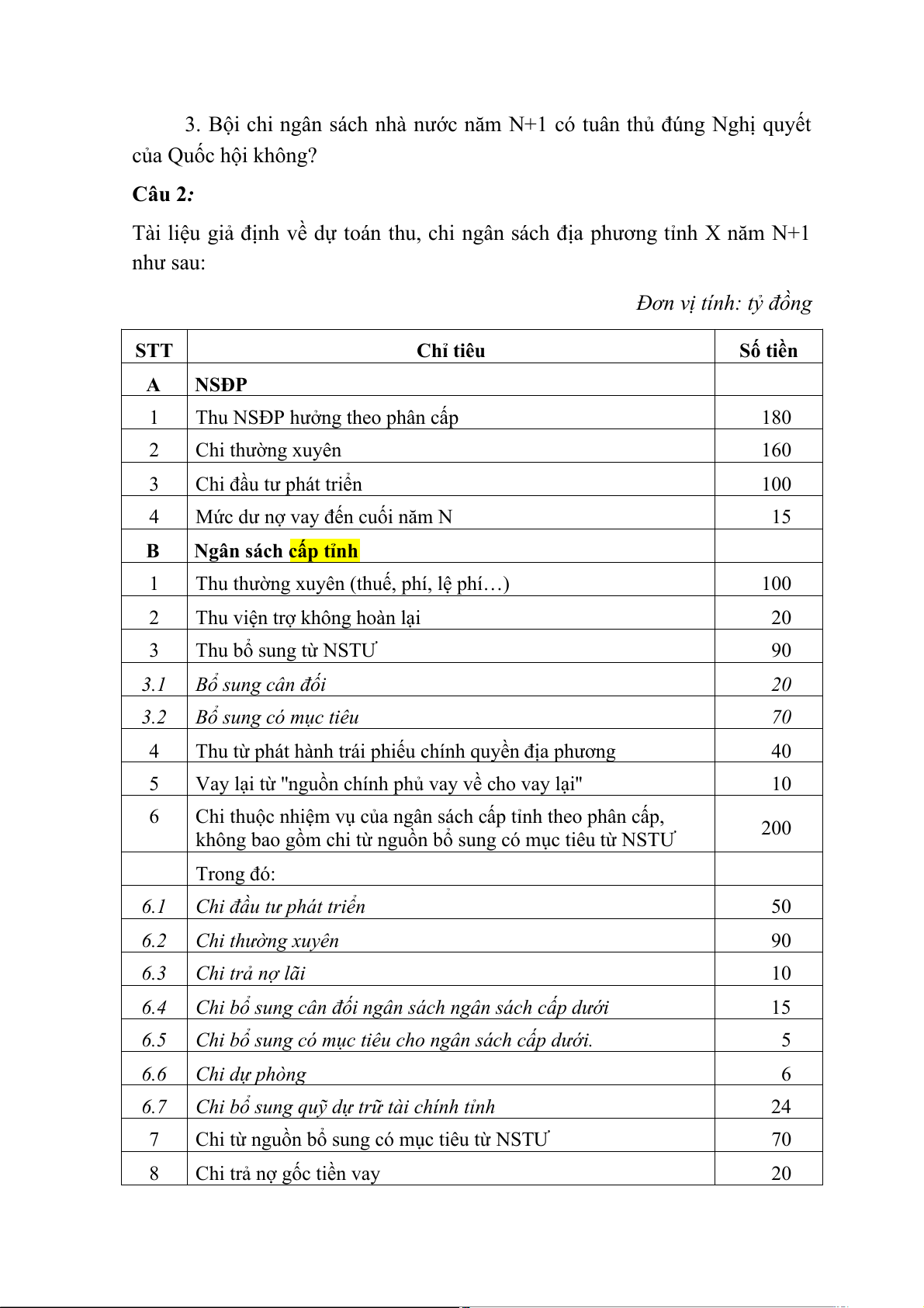 3. Bội chi ngân sách nhà nước năm N+1 có tuân thủ đúng Nghị quyết của Quốc hội không? Câu 2: