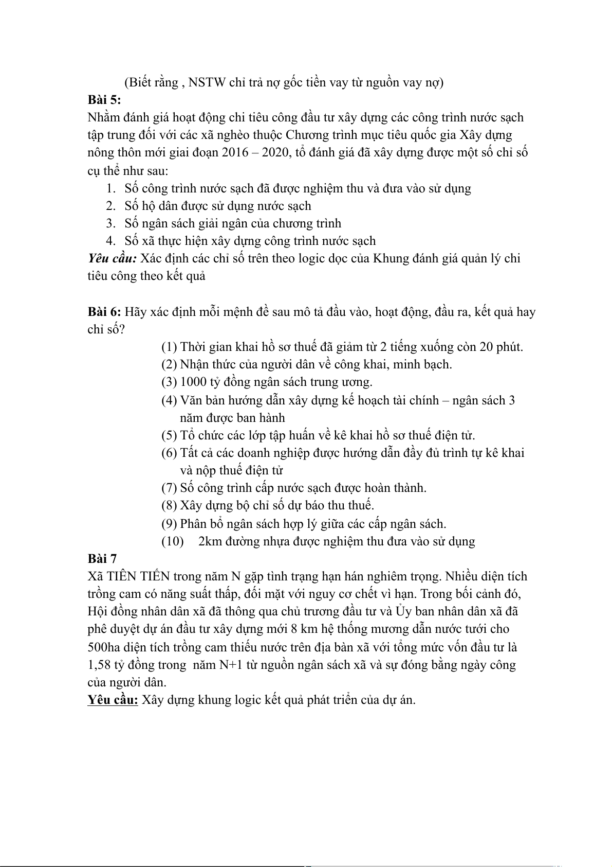 Yêu cầu: Xác định các chỉ số trên theo logic dọc của Khung đánh giá quản lý chi tiêu công theo kết quả